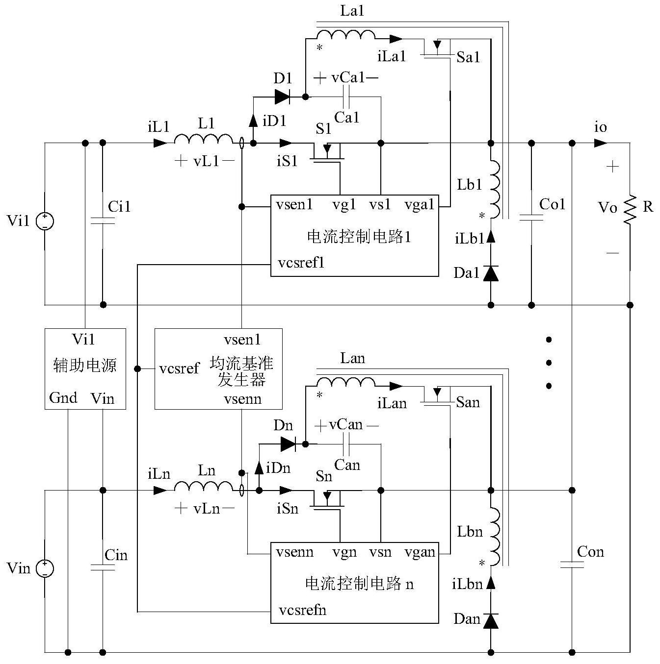 所述功率主回路由完整通道电路1至完整通道电路n组成,所述完整通道电路j(j=1,...,n)包括输入电容Cij、电感Lj、N-MOS主管Sj、N-MOS辅助管Saj、辅助电容Caj、耦合电感Laj和Lbj、二极管Dj、辅助二极管Daj、输出电容Coj,直流电源Vij(j=1,...,n)的正端与输入电容Cij的一端以及电感Lj的一端相连,电感Lj的另一端与二极管Dj的阳极以及N-MOS主管Sj的漏极相连,二极管Dj的阴极与耦合电感Laj的一端以及辅助电容Caj的一端相连,耦合电感Laj的另一端与N-MOS辅助管Saj的漏极相连,N-MOS主管Sj的源极与辅助电容Caj的另一端、N-MOS辅助管Saj的源极、耦合电感Lbj的一端(与所述耦合电感Laj的另一端是同名端关系)、输出电容Coj的一端、输出电压Vo的正端以及负载R的一端相连,耦合电感Lbj的另一端(与所述耦合电感Laj的一端是同名端关系)与辅助二极管Daj的阴极相连,辅助二极管Daj的阳极与直流电源Vij的负端、输入电容Cij的另一端、输出电容Coj的另一端、输出电压Vo的负端以及负载R的另一端相连,耦合电感Lbj与辅助二极管Daj的接点和耦合电感Laj与二极管Dj的接点是同名端关系,所述控制回路由电流控制电路1至电流控制电路n和均流基准发生器组成,所述电流控制电路j(j=1,...,n)拥有端口vsenj、端口vgj、端口vsj、端口vgaj、端口vcsrefj,所述均流基准发生器拥有端口vsenj和端口vcsref,所述电流控制电路j的端口vsenj接收所述所述电感Lj的电流iLj的检测信号,所述电流控制电路j的端口vgj与所述N-MOS主管Sj的门极相连,所述电流控制电路j的端口vsj与所述N-MOS主管Sj的源极以及所述N-MOS辅助管Saj的源极相连,所述电流控制电路j的端口vgaj与所述N-MOS辅助管Saj的门极相连,所述电流控制电路j的端口vcsrefj与所述均流基准发生器的端口vcsref相连,所述均流基准发生器的端口vsenj接收所述电感Lj的电流iLj的检测信号,所述辅助电源能为所述控制回路提供所需的工作电压,拥有端口Vij(j=1,...,n)和端口Gnd,所述辅助电源的端口Vij与所述直流电源Vij的正端相连,所述辅助电源的端口Gnd与所述直流电源Vij的负端相连。
