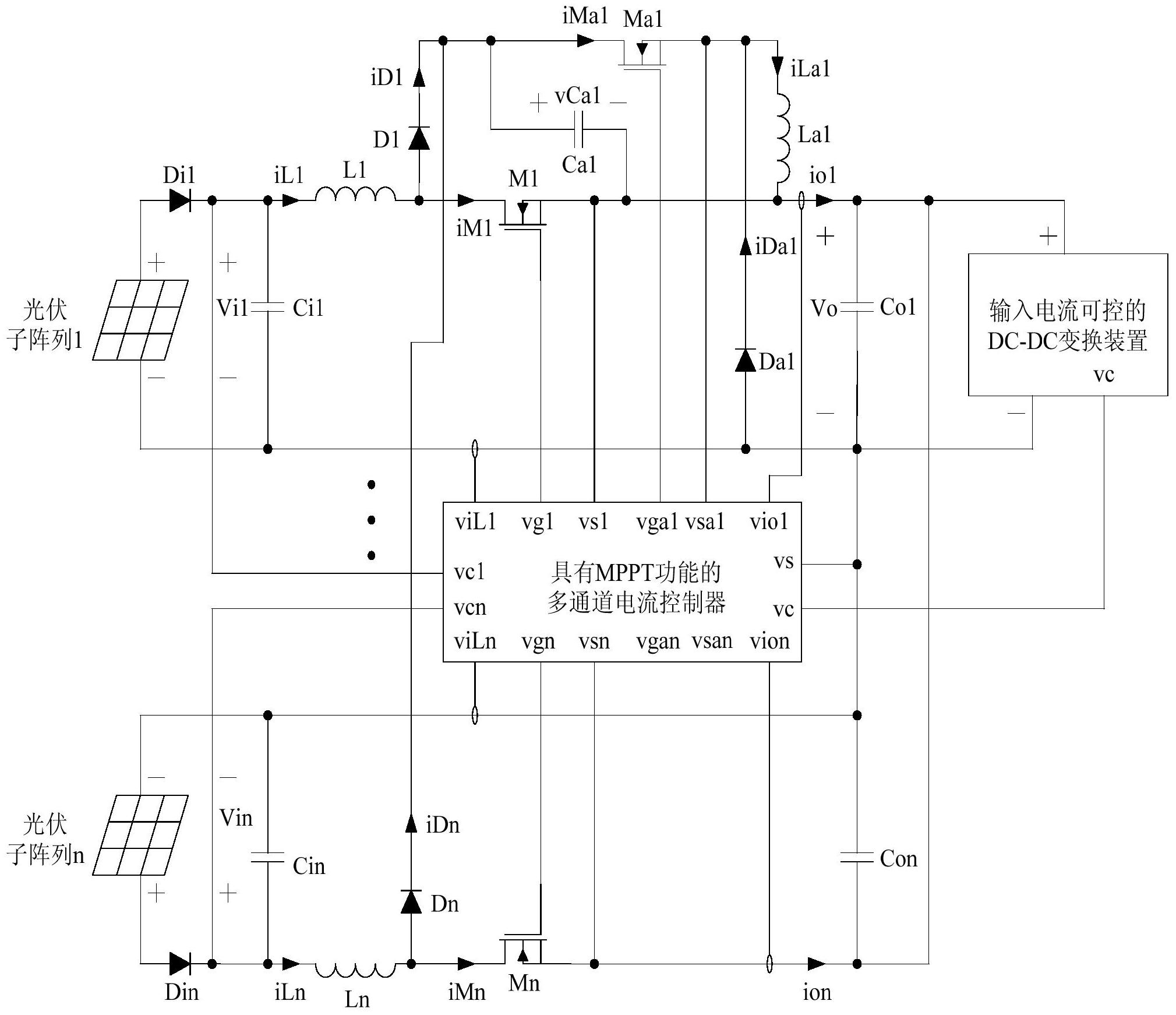 1.一种适用于光伏阵列的能馈式MPPT接口电路,其特征在于:所述适用于光伏阵列的能馈式MPPT接口电路由功率主回路和具有MPPT功能的多通道电流控制器2部分组成,所述功率主回路由完整通道电路1和简化通道电路2至简化通道电路n组成,所述完整通道电路1由阻塞二极管Di1、输入电容Ci1、电感L1、N-MOS主管M1、二极管D1、辅助电容Ca1、N-MOS辅助管Ma1、辅助电感La1、辅助二极管Da1、输出电容Co1构成,光伏子阵列1的正输出端与阻塞二极管Di1的阳极相连,阻塞二极管Di1的阴极与输入电压Vi1的正端、输入电容Ci1的一端以及电感L1的一端相连,电感L1的另一端与N-MOS主管M1的漏极以及二极管D1的阳极相连,二极管D1的阴极与辅助电容Ca1的一端以及N-MOS辅助管Ma1的漏极相连,N-MOS辅助管Ma1的源极与辅助电感La1的一端以及辅助二极管Da1的阴极相连,辅助电感La1的另一端与N-MOS主管M1的源极、辅助电容Ca1的另一端、输出电容Co1的一端、输出电压Vo的正端以及输入电流可控的DC-DC变换装置的正输入端相连,辅助二极管Da1的阳极与光伏子阵列1的负输出端、输入电压Vi1的负端、输入电容Ci1的另一端、输出电容Co1的另一端、输出电压Vo的负端以及输入电流可控的DC-DC变换装置的负输入端相连,所述简化通道电路k由阻塞二极管Dik、输入电容Cik、电感Lk、N-MOS主管Mk、二极管Dk、输出电容Cok构成,其中k的取值为k=2,…,n,光伏子阵列k的正输出端与阻塞二极管Dik的阳极相连,阻塞二极管Dik的阴极与输入电压Vik的正端、输入电容Cik的一端以及电感Lk的一端相连,电感Lk的另一端与N-MOS主管Mk的漏极以及二极管Dk的阳极相连,二极管Dk的阴极与所述完整通道电路1中的二极管D1的阴极相连,N-MOS主管Mk的源极与输出电容Cok的一端、输出电压Vo的正端以及输入电流可控的DC-DC变换装置的正输入端相连,光伏子阵列k的负输出端与输入电压Vik的负端、输入电容Cik的另一端、输出电容Cok的另一端、输出电压Vo的负端以及输入电流可控的DC-DC变换装置的负输入端相连,所述具有MPPT功能的多通道电流控制器拥有端口vcj、端口vs、端口vgj、端口vsj、端口vgaj、端口vsaj、端口viLj、端口vioj、端口vc,其中j的取值为j=1,…,n,所述具有MPPT功能的多通道电流控制器的端口vc1与所述输入电压Vi1的正端相连,所述具有MPPT功能的多通道电流控制器的端口vs与所述输入电压Vi1的负端相连,所述具有MPPT功能的多通道电流控制器的端口vg1与所述N-MOS主管M1的门极相连,所述具有MPPT功能的多通道电流控制器的端口vs1与所述N-MOS主管M1的源极相连,所述具有MPPT功能的多通道电流控制器的端口vga1与所述N-MOS辅助管Ma1的门极相连,所述具有MPPT功能的多通道电流控制器的端口vsa1与所述N-MOS辅助管Ma1的源极相连,所述具有MPPT功能的多通道电流控制器的端口viL1接收所述电感L1的电流iL1的检测信号,所述具有MPPT功能的多通道电流控制器的端口vio1接收所述完整通道电路1的输出电流io1的检测信号,所述具有MPPT功能的多通道电流控制器的端口vc向所述输入电流可控的DC-DC变换装置的端口vc发送所述功率主回路的输出总电流信息,所述具有MPPT功能的多通道电流控制器的端口vck与所述输入电压Vik的正端相连,所述具有MPPT功能的多通道电流控制器的端口vs与所述输入电压Vik的负端相连,所述具有MPPT功能的多通道电流控制器的端口vgk与所述N-MOS主管Mk的门极相连,所述具有MPPT功能的多通道电流控制器的端口vsk与所述N-MOS主管Mk的源极相连,所述具有MPPT功能的多通道电流控制器的端口vgak和端口vsak均悬空,所述具有MPPT功能的多通道电流控制器的端口viLk接收所述电感Lk的电流iLk的检测信号,所述具有MPPT功能的多通道电流控制器的端口viok接收所述简化通道电路k的输出电流iok的检测信号,其中k的取值为k=2,…,n。