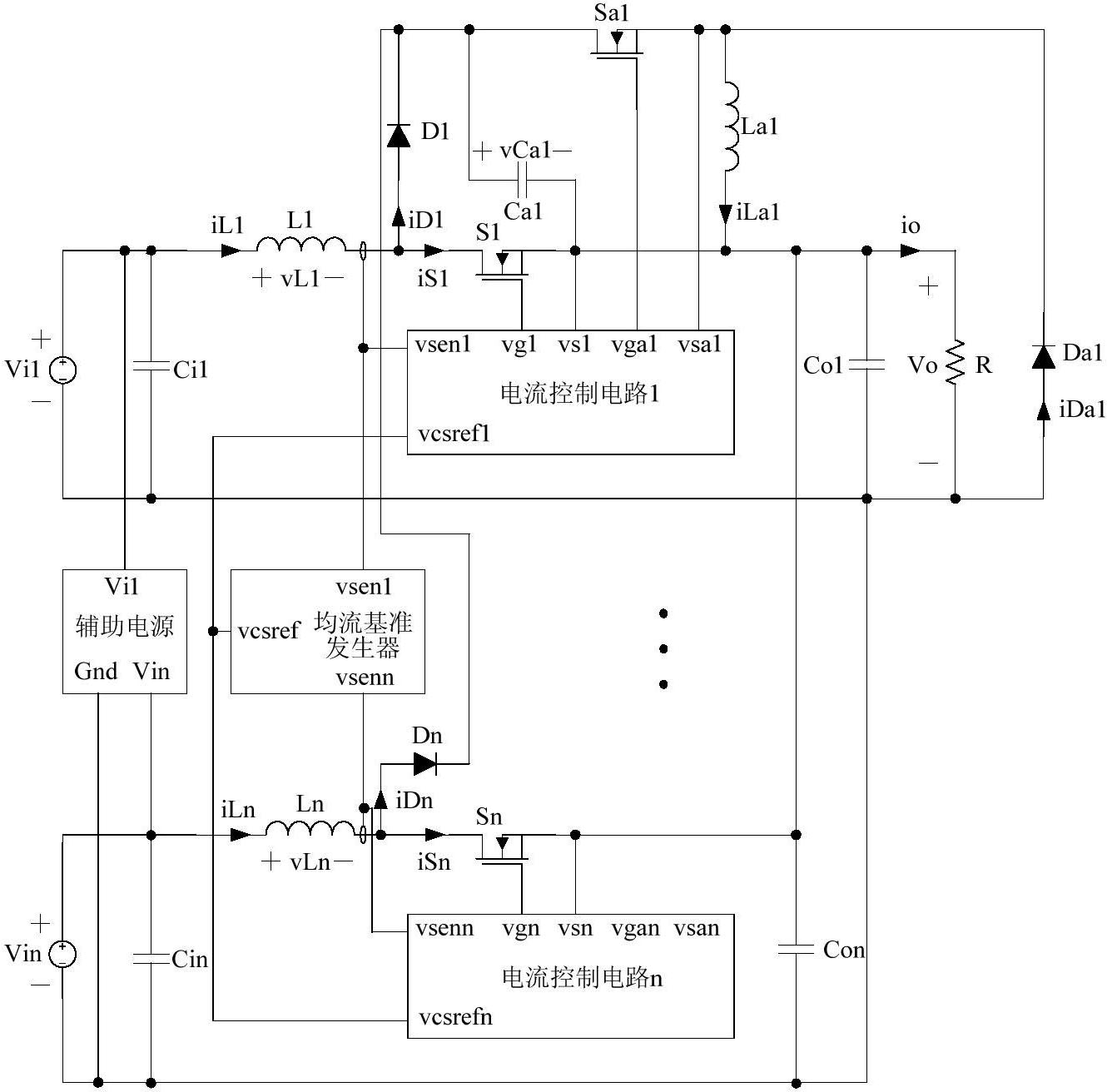 1中的二极管D1的阴极相连,N-MOS主管Sk的源极与输出电容Cok的一端、输出电压Vo的正端以及负载R的一端相连,直流电源Vik的负端与输入电容Cik的另一端、输出电容Cok的另一端、输出电压Vo的负端以及负载R的另一端相连,所述控制回路由电流控制电路1至电流控制电路n和均流基准发生器组成,所述电流控制电路j的取值是j=1,...,n,所述电流控制电路j拥有端口vsenj、端口vgj、端口vsj、端口vgaj、端口vsaj、端口vcsrefj,所述均流基准发生器拥有端口vsenj和端口vcsref,当所述电流控制电路j的取值是j=1时,所述电流控制电路1的端口vsen1接收所述电感L1的电流iL1的检测信号,所述电流控制电路1的端口vg1与所述N-MOS主管S1的门极相连,所述电流控制电路1的端口vs1与所述N-MOS主管S1的源极相连,所述电流控制电路1的端口vga1与所述N-MOS辅助管Sa1的门极相连,所述电流控制电路1的端口vsa1与所述N-MOS辅助管Sa1的源极相连,所述电流控制电路1的端口vcsref1与所述均流基准发生器的端口vcsref相连,所述均流基准发生器的端口vsen1接收所述电感L1的电流iL1的检测信号,当所述电流控制电路j的取值是j=k且k=2,...,n时,所述电流控制电路k的端口vsenk接收所述电感Lk的电流iLk的检测信号,所述电流控制电路k的端口vgk与所述N-MOS主管Sk的门极相连,所述电流控制电路k的端口vsk与所述N-MOS主管Sk的源极相连,所述电流控制电路k的端口vgak和端口vsak均悬空,所述电流控制电路k的端口vcsrefk与所述均流基准发生器的端口vcsref相连,所述均流基准发生器的端口vsenk接收所述电感Lk的电流iLk的检测信号,所述辅助电源能为所述控制回路提供所需的工作电压,拥有端口Vij和端口Gnd,所述辅助电源的端口Vij的取值是j=1,...,n,所述辅助电源的端口Vij与所述直流电源Vij的正端相连,所述辅助电源的端口Gnd与所述直流电源Vij的负端相连。