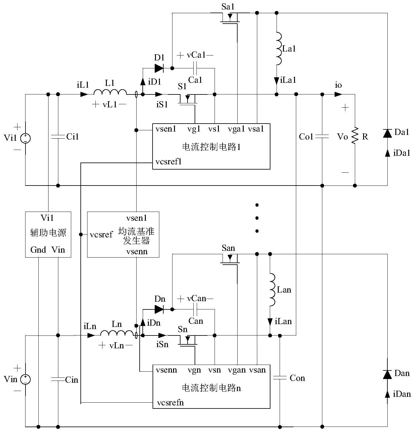 所述功率主回路由完整通道电路1至完整通道电路n组成,完整通道电路j(j=1,...,n)由输入电容Cij、电感Lj、N-MOS主管Sj、二极管Dj、辅助电容Caj、辅助电感Laj、N-MOS辅助管Saj、辅助二极管Daj和输出电容Coj构成,直流电源Vij的正端与输入电容Cij的一端以及电感Lj的一端相连,电感Lj的另一端与N-MOS主管Sj的漏极以及二极管Dj的阳极相连,二极管Dj的阴极与辅助电容Caj的一端以及N-MOS辅助管Saj的漏极相连,N-MOS辅助管Saj的源极与辅助电感Laj的一端以及辅助二极管Daj的阴极相连,电感Laj的另一端与辅助电容Caj的另一端、N-MOS主管Sj的源极、输出电容Coj的一端、输出电压Vo的正端以及负载R的一端相连,直流电源Vij的负端与输入电容Cij的另一端、输出电容Coj的另一端、辅助二极管Daj的阳极、输出电压Vo的负端以及负载R的另一端相连,所述控制回路由电流控制电路1至电流控制电路n和均流基准发生器组成,所述电流控制电路j(j=1,...,n)拥有端口vsenj、端口vgj、端口vsj、端口vgaj、端口vsaj、端口vcsrefj,所述均流基准发生器拥有端口vsenj和端口vcsref,所述电流控制电路j(j=1,...,n)的端口vsenj接收所述电感Lj的电流iLj的检测信号,所述电流控制电路j的端口vgj与所述N-MOS主管Sj的门极相连,所述电流控制电路j的端口vsj与所述N-MOS主管Sj的源极相连,所述电流控制电路j的端口vgaj与所述N-MOS辅助管Saj的门极相连,所述电流控制电路j的端口vsaj与所述N-MOS辅助管Saj的源极相连,所述电流控制电路j的端口vcsrefj与所述均流基准发生器的端口vcsref相连,所述均流基准发生器的端口vsenj接收所述电感Lj的电流iLj的检测信号,所述辅助电源能为所述控制回路提供所需的工作电压,拥有端口Vij(j=1,...,n)和端口Gnd,所述辅助电源的端口Vij与所述直流电源Vij的正端相连,所述辅助电源的端口Gnd与所述直流电源Vij的负端相连。