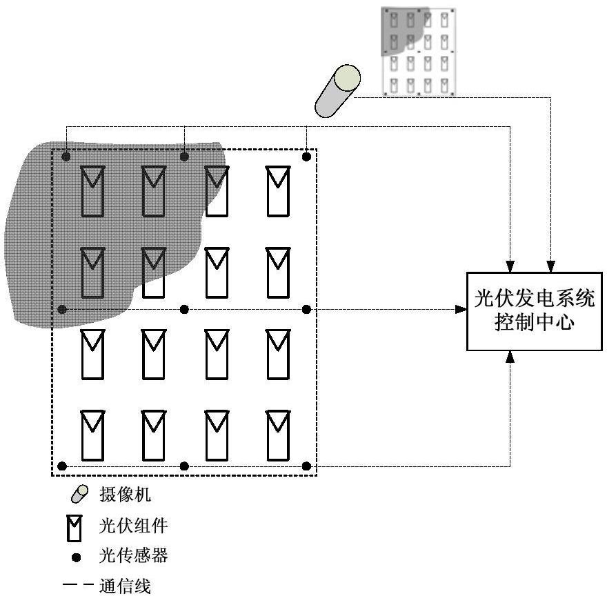 1.光伏阵列辐照度测量辨识方法,涉及光伏阵列、光传感器、图像采集装置、通信网络、光伏发电控制中心等主要设备,具体包括下列步骤: 步骤1,确定光伏阵列的分布范围及阵列中光伏组件的排列位置,并作标记, 步骤2,布置光传感器的安装位置,用其测量安装地点的辐照度,辐照度数据需要标记记录时刻的时间和位置,以便与采集的图像保持同步,辐照度及其采集时间和位置信息通过通信网络传送到光伏发电系统控制中心,光传感器布置方案有两种可选: a)固定布置方式:在光伏阵列的四角、四周中点、中心等典型位置安装光传感器,并配置通信网络,将辐照度及其采集时间和位置信息传递到控制中心; b)运动布置方式:在光伏阵列的四周以及光伏电池板之间设置轨道安装可移动的光传感器,让光传感器沿轨道匀速运动的同时测量其经过各点的辐照度,并配置通信网络,将辐照度及其对应的位置和时间信息传送到控制中心; 步骤3,设置图像采集装置的拍摄位置,图像采集装置拍摄光伏阵列的运行图像,并标记图像采集时刻的时间和位置,以便与辐照度测量数据保持同步,图像及其拍摄时间和位置信息通过通信网络传送到光伏发电系统控制中心;图像采集装置的拍摄位置三种方案可供选择: c)固定不变:图像采集装置的安装位置保持固定不变,确保其能够拍摄到完整的光伏阵列图像;
