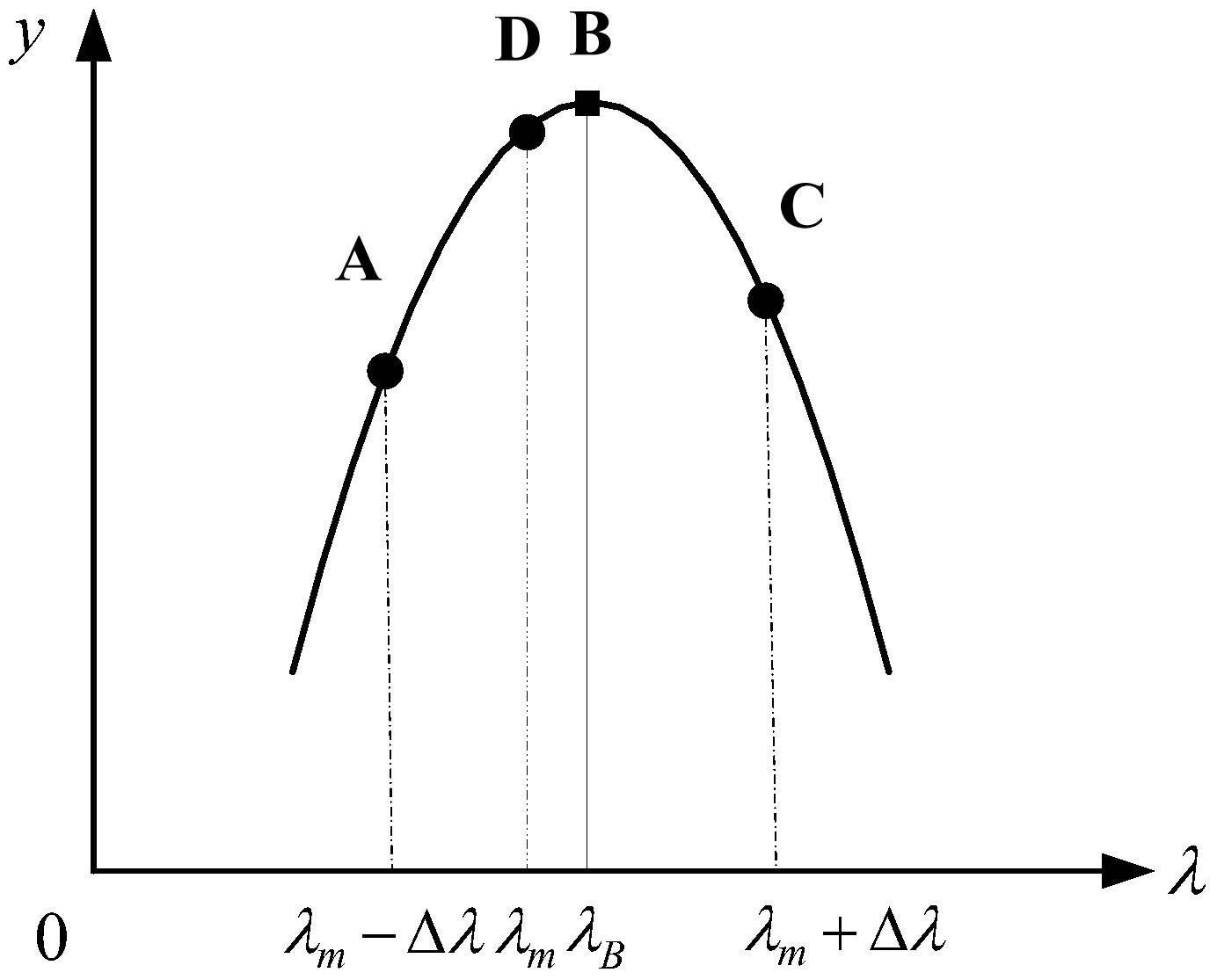 (1.3)稀疏光谱数据的获得与处理:通过试探法得到稀疏光谱数据的个数,评价指标为峰值误差,在峰值误差达到最小时对应的数据个数为最佳稀疏光谱数据;得到稀疏光谱数据之后,采用多项式拟合方法对数据点进行拟合,用二次多项式进行拟合得到拟合结果,根据拟合结果计算求得最大值λm,即得到最大值点D的坐标(λm,y2)(1.4)选取合适的数据间隔Δλ,得到相邻数据点A和C:用试探法将Δλ的取值以精度0.01nm从0到0.4nm递增,评价指标为峰值误差,将峰值误差最小对应的Δλ值为最终选取结果;然后以λm-Δλ和λm+Δλ为横坐标选取相邻数据点A和C,其坐标分别为(λm-Δλ,y1)和(λm+Δλ,y3);
