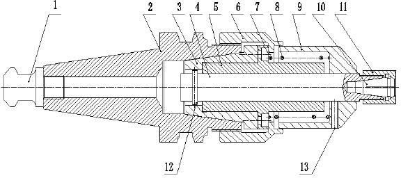 1.一种旋转刮削刀具,其特征在于:包括刀柄,刀柄的前端与连接套固定连接;连接套内活动设置有刀杆;连接套通过滑动轴承实现与刀杆的活动连接; 刀杆的前端从调节套伸出,刀杆的前端设置有弹性夹筒;弹性夹筒用于夹持旋转刮刀;通过锁紧螺母实现刀杆与旋转刮刀的固定连接; 刀杆的后端沿径向固定穿设有滑动销轴,滑动销轴的两端抵住连接套的内孔壁; 刀杆能够带动其上的滑动销轴在滑动轴承内沿轴向滑动; 机床主轴旋转带动刀柄及连接套旋转,连接套的旋转通过滑动销轴带动刀杆及旋转刮刀同步旋转;旋转刮刀刀刃与加工面接触,实现对加工面的旋转刮削。