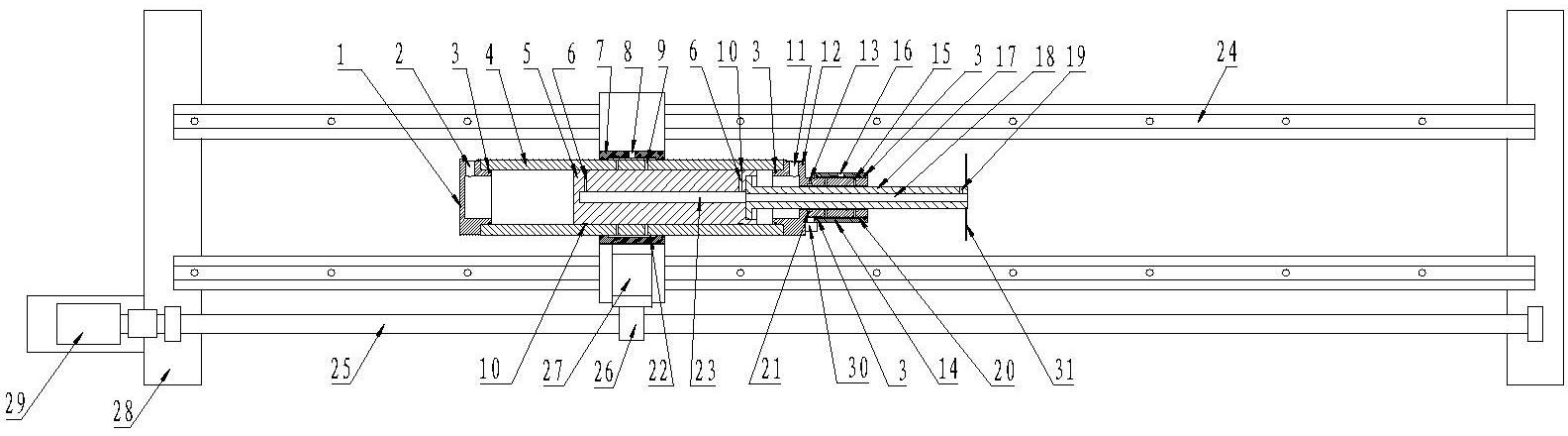所述输出气缸包括活塞、活塞杆、缸筒、端盖、缸筒盖、进气套,所述所述缸筒下安装连接板,所述连接板与滑块固接,所述滚珠丝杠通过螺母座连接连接板;