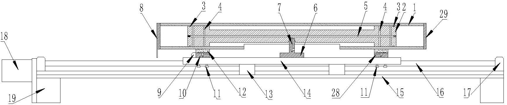 1.长距离恒力输出气浮装置,其特征在于:包括输出气缸和跟随系统;所述输出气缸包括缸筒、连杆活塞、端盖、气浮垫;所述跟随系统包括直线导轨、滑块、固定板、连接支架、电机、激光位移传感器、反光板;