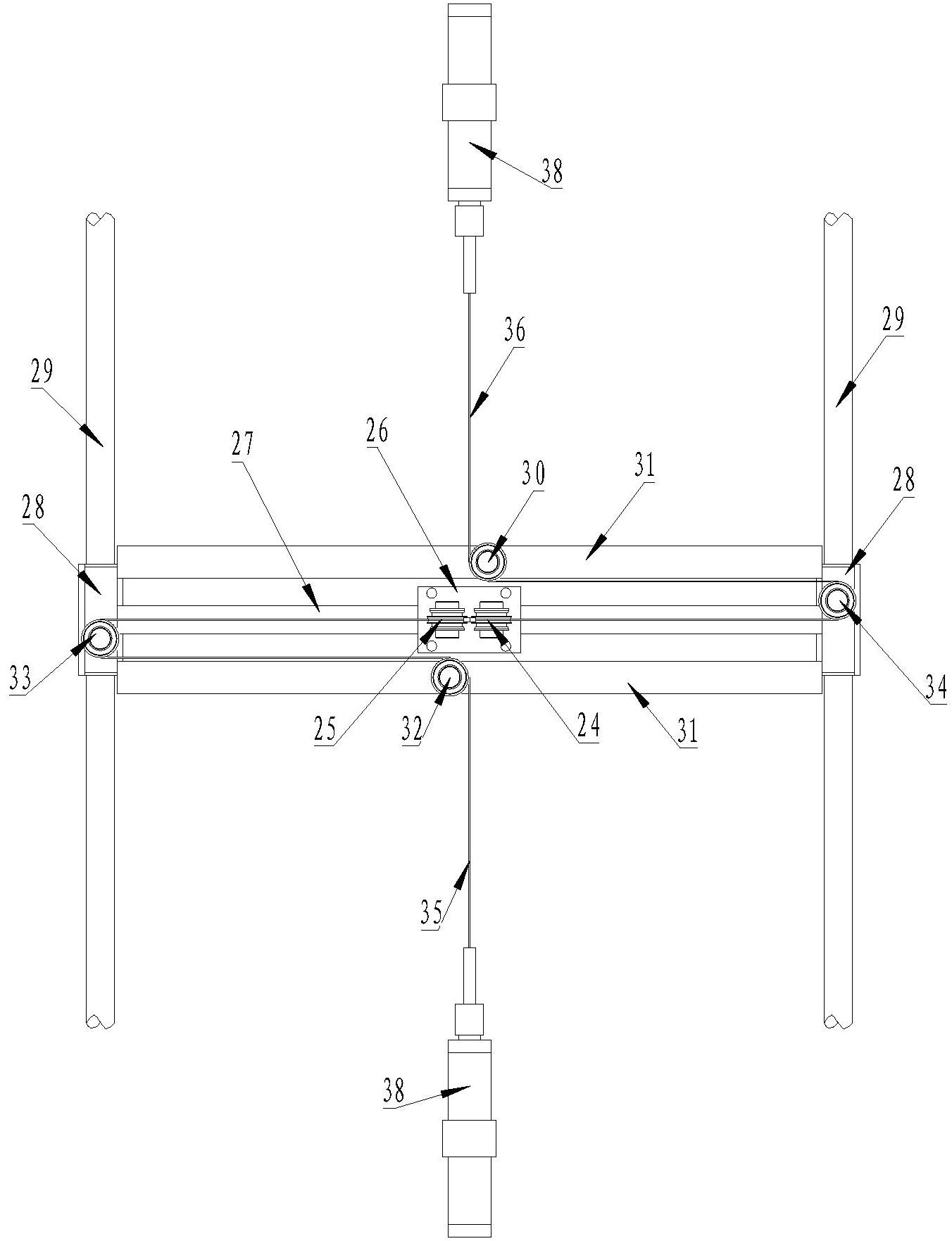 所述滑轮组包括两个竖直安装的第一定滑轮、第二定滑轮和四个水平安装的第三定滑轮、第四定滑轮、第五定滑轮和第六定滑轮,所述第一定滑轮和第二定滑轮通过安装座固定在横向气浮套的下方,所述第三定滑轮和第四定滑轮分别固定在两个纵向气浮套的下方,所述第五定滑轮和第六定滑轮分别固定在两跟水平支架的下方;所述滑轮组内的定滑轮均为气浮轴承滑轮;