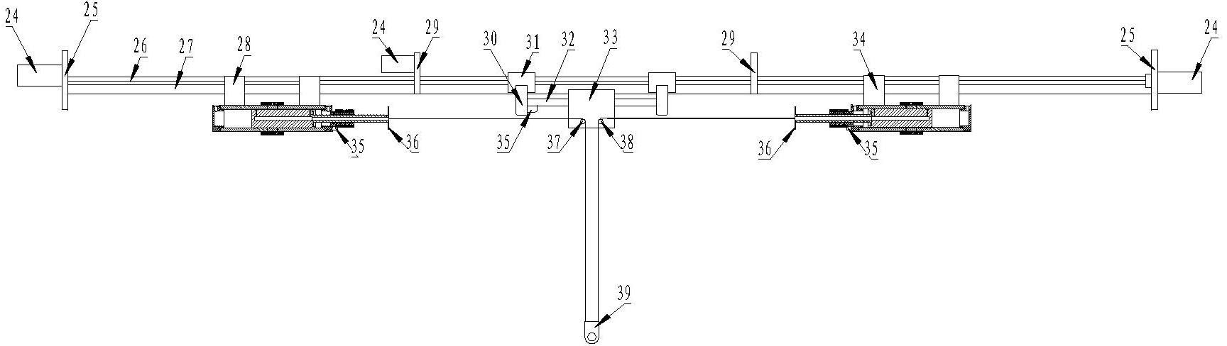 1.一种可实现长距离二维跟随的恒力吊挂装置,其特征在于:包括恒力输出气缸、气浮装置、导轨系统、滑轮组、悬挂绳、吊挂座、检测装置等; 所述导轨系统包括直线导轨、第一滑块、第二滑块、第三滑块和电机;所述直线导轨安装在水平横梁上且两端通过支架支撑,所述直线导轨上安装两个挡块,所述第一滑块套装在直线导轨上且位于两个挡块之间,所述第二滑块、第三滑块套装在直线导轨上且分别位于挡块两边的,所述电机有三个,分别安装在两个支架和挡块上,所述电机可独立驱动第一滑块、第二滑块、第三滑块; 所述恒力输出气缸有两个且分别连接第二滑块、第三滑块,所述气浮装置连接第一滑块; 所述气浮装置包含气浮座、气浮轴、气浮套;所述气浮套套装在气浮轴上,所述气浮轴两端通过气浮座支撑,所述气浮座连接第一滑块; 所述恒力输出气缸包含活塞、活塞杆、缸筒、端盖、缸筒盖、进气套;所述活塞杆连接活塞,所述活塞套装在缸筒内且和缸筒壁间存有极小间隙,所述缸筒两端分别套装端盖和缸筒盖,所述活塞杆穿过缸筒盖连接悬挂绳,所述活塞杆和缸筒盖内壁间存有极小间隙;所述滑轮组包含第一定滑轮、第二定滑轮,所述第一定滑轮和第二定滑轮与气浮套固接; 所述吊挂座连接目标工件,所述吊挂座上连接两根悬挂绳,所述两根悬挂绳分别绕过第一定滑轮、第二定滑轮连接同侧恒力输出气缸的活塞杆; 所述检测装置包括激光位移传感器和反光板,所述激光位移传感器有三个且分别安装在气浮座和两个恒力输出气缸的 缸筒盖上,所述反光板有两个且套装在活塞杆上,所述激光位移传感器可分别测量出气浮套和活塞杆的位移。