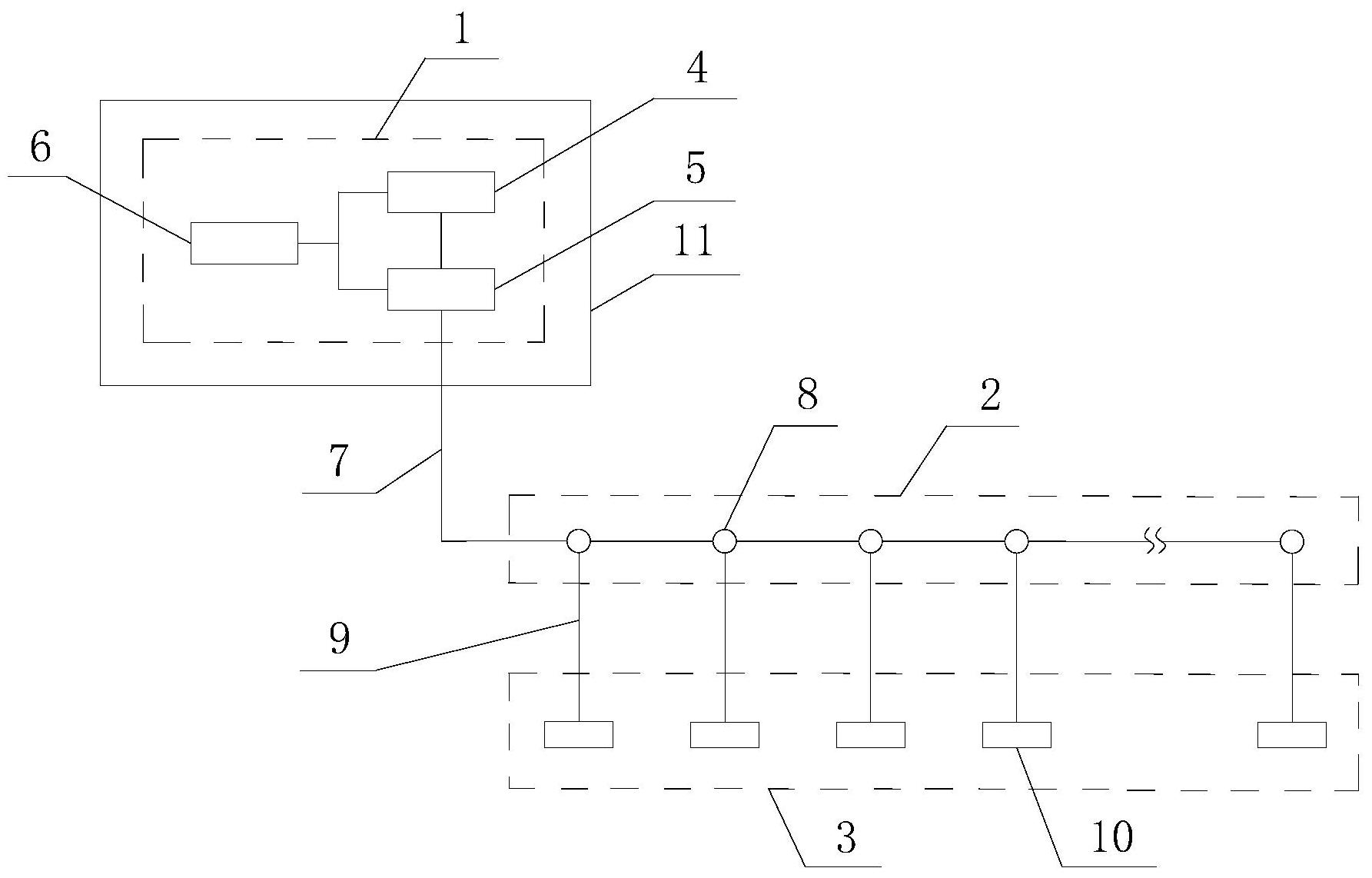 1.一种基于光纤光栅的巷道顶板离层动态监测系统,其特征是:包括地面数据处理及控制子系统、井下数据传输通讯子系统、井下传感数据采集子系统三部分;所述的地面数据处理及控制子系统安放在地面控制中心室内,地面数据处理及控制子系统由地面上位主监控计算机、光纤光栅解调装置和供电电源组成,供电电源为地面上位主监控计算机和光纤光栅解调装置提供额定的电源;所述的井下数据传输通讯子系统由矿用传输光纤和光纤接线盒组成,其中矿用传输光纤上串联一系列光纤接线盒;所述的井下传感数据采集子系统包括至少一个光纤光栅顶板离层监测装置,光纤光栅顶板离层监测装置通过光纤尾纤与光纤接线盒连接,所述的井下传感数据采集子系统的各个光纤光栅顶板离层监测装置通过光纤尾纤和光纤接线盒与矿用传输光纤连接,矿用传输光纤与地面控制中心室的光纤光栅解调装置连接,光纤光栅解调装置与地面上位主监控计算机连接;形成监测系统地面和井下相互通讯的远程巷道顶板离层动态监测系统。