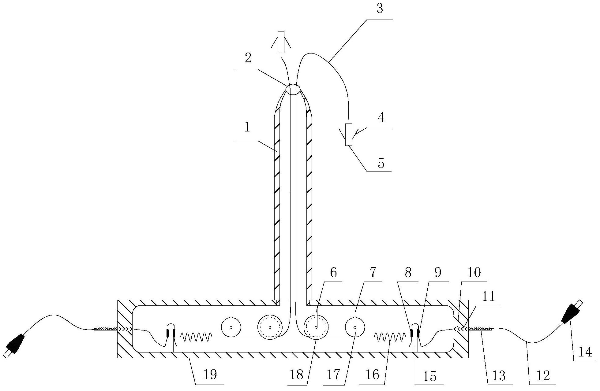 1.一种矿用光纤光栅顶板离层监测装置,包括封装壳体(19)、光纤(12)、光纤光栅、拉力弹簧(16)、钢丝绳(3)、锚固头(5),其特征在于:还包括设在顶板钻孔内的垂直测筒(1),封装壳体(19)连接在垂直测筒(1)下,所述的封装壳体(19)上部对称设有定滑轮固定架(6)、钢带轮固定架(7),下部对称设有等强度悬臂梁(15),封装壳体(19)的左右两侧对称开有光纤导出孔(10),所述的滑轮固定架(6)上设有定滑轮(18),所述的钢带轮固定架(7)上设有钢带轮(17),所述对称设置的等强度悬臂梁(15)相对一端分别设有拉力弹簧(16),两根拉力弹簧(16)另一端连接有钢丝绳(3),钢丝绳(3)穿过刚带轮(17)和定滑轮(18)从垂直测筒(1)顶部的钢丝绳引出孔(2)穿出,穿出钢丝绳引出孔(2)的钢丝绳(3)的端头连接锚固头(5),锚固头(5)上至少设有两个锚固爪(4);所述的等强度悬臂梁(15)左右两侧对称设有A光纤光栅(8)和B光纤光栅(9),A光纤光栅(8)与B光纤光栅(9)经同一条光纤(12)从光纤导出孔(10)穿出与光纤接线头(14)连接,光纤导出孔(10)内注有封住光纤导出孔(10)的密封胶(11),从光纤导出孔(10)引出的光纤(12)铠装有胶皮保护层(13)。