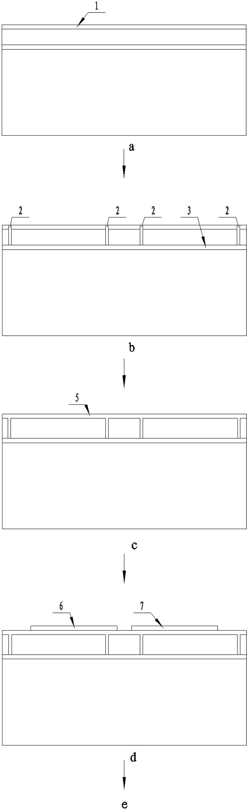 b、采用深硅刻蚀工艺在SOI衬底正面加工两个矩形环路状的隔离槽(2),所述隔离槽(2)以SOI衬底的隐埋氧化层(3)为底,两隔离槽(2)横向并排设置,在SOI衬底正面划分出了两个热电偶加工区(4),且两隔离槽(2)间留有后续加工用空间;