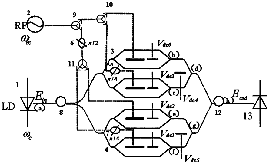 所述上路双平行马赫-曾德尔调制器(DPMZM)的一个射频输入端口连接有对射频源的射频信号产生45°相移差的第一移相器;所述下路双平行马赫-曾德尔调制器(DPMZM)的一个射频输入端口连接有对射频源的射频信号产生90°相移差的第二移相器;所述下路双平行马赫曾德尔调制器的另一个射频输入端口连接有依次对射频源的射频信号产生90°相移差的第二移相器和产生45°相移差的第三移相器;双平行马赫-曾德尔调制器的两个子调制器均工作在最大点,主调制器工作在最小点;