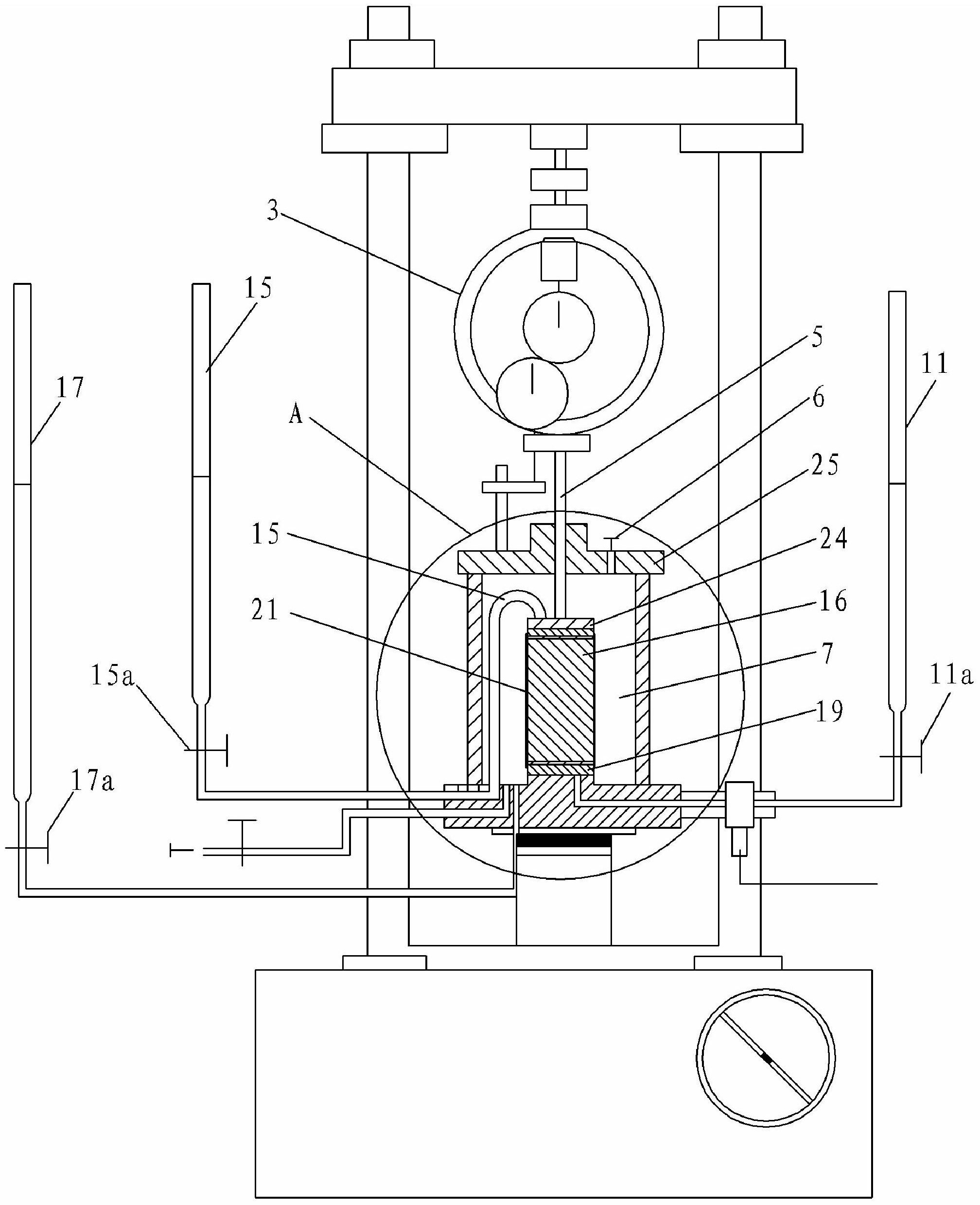 直到上排水管(15)的读数 连续三次保持不变,且下排水管(11)的读数 也连续三次保持不变,结束试验;在试验过程中,当上、下排水管(15、11)的液面接近膨胀土试样(16)顶部时,即向其注水,使上、下排水管(15、11)的液面高出膨胀土试样(16)的顶部,以保证膨胀土试样(16)时刻处于吸水状态;同时,当读出的测力环(3)的读数△σ<σ1-σ3时,须转动加压手轮,增加活塞施加于试样上部的荷载△σ直至△σ=σ1-σ3时,保持该加载载荷;