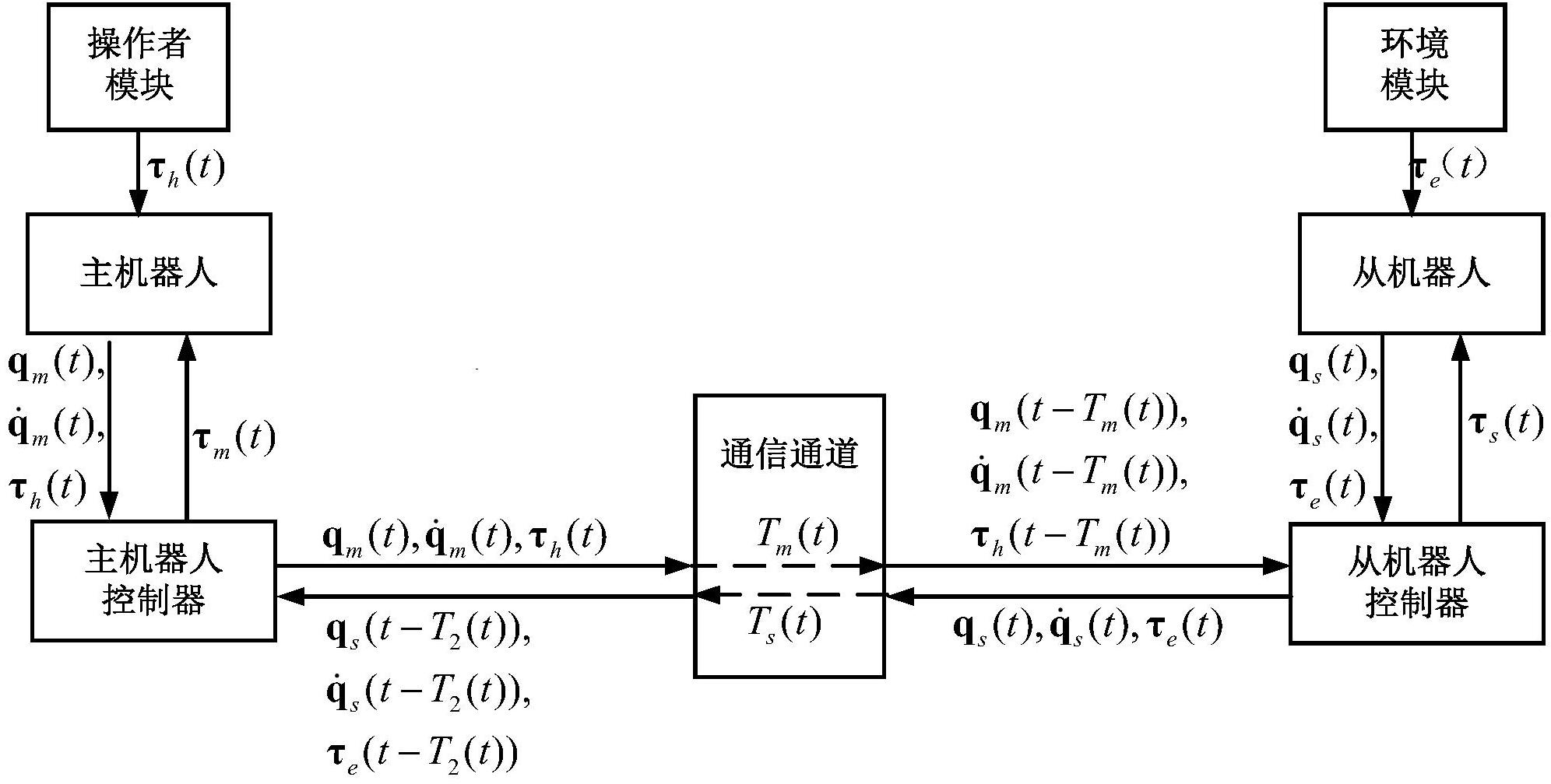 所述通信通道的前向时变时延为Tm(t),反向时变时延为Ts(t);主机器人的位置qm(t)、主机器人的速度 操作者与主机器人的交互力τh(t),通过通信通道分别变为qm(t-Tm(t))、 τh(t-Tm(t))传输给从机器人控制器;从机器人的位置qs(t)、从机器人的速度 从机器人与环境的交互力τe(t),通过通信通道分别变为qs(t-Ts(t))、τe(t-Ts(t))反馈给主机器人控制器;