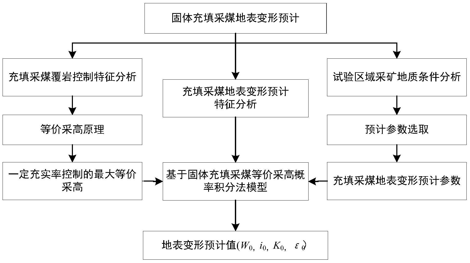 1.一种固体充填采煤地表变形预计方法,其特征是:在固体充填采煤岩层和地表变形特征分析的基础上,建立一种基于等价采高的概率积分地表变形预计模型;根据矿区地质条件确定模型的预计参数,然后根据充填采煤岩层移动控制的基本原理,确定一定充实率控制的最大等价采高Me,将该充实率 控制的最大等价采高Me及预计参数代入预计模型求出该充实率条件下地表变形预计值,即最大下沉值W0、最大倾斜值i0、最大曲率值K0、及最大水平变形值ε0;