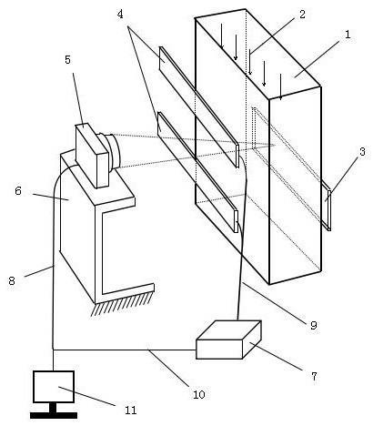 1.一种棉花异纤在线检测照明装置的均匀性调节方法,采用棉花异纤在线检测照明装置,该棉花异纤在线检测照明装置包括背景板(3)、光源板(4)和CCD线阵相机(5),光源板(4)和CCD线阵相机(5)位于棉流通道的同一侧,背景板(3)位于棉流通道的另一侧,两块光源板(4)位于靠近棉流通道位置处且有缝隙地上下垂直放置,CCD线阵相机(5)位于远离棉流通道位置处且正对准所述缝隙,背景板(3)垂直放置也正对准所述缝隙;每块光源板(4)均有n个LED灯(13)且分两排布置,n个LED灯(13)均通过LED灯电源总线与控制模块(7)连接,控制模块(7)通过控制总线与计算机(11)连接,其特征是:先用CCD线阵相机(5)对棉流进行图像采集,将采集到的图像传给计算机(11),计算机(11)对接收到的图像进行处理,用阈值分割法将图像分割为q个区域,对分割后的各个区域进行图像亮度特征提取并确定各区域图像的亮度级数,若该区域的亮度级数大于所允许的最大的亮度级数或小于所允许的最小的亮度级数,则对该区域对应的LED灯(13)进行亮度调整。