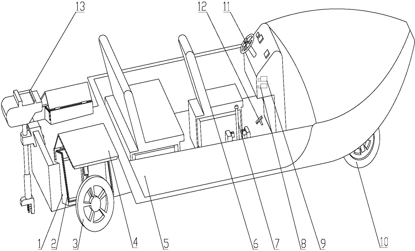 1.一种水陆两栖船的后车轮收起保护机构,其特征是,它包括:保护箱,保护箱设置在船体后部两侧,保护箱的底部要高于船体底部;