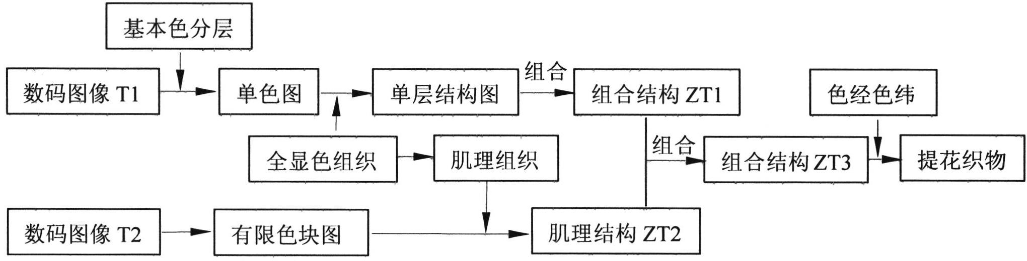 将T1数码图案根据基本色分色获得的分色图处理成灰度模式,各图的灰度级别不超过设计的全显色组织数目,确定灰度图像中黑到白与全显色组织中的纬面到经面组织的替代关系,并保持不变,①将完成的分色图层中奇数层图像灰度与全显色基础组织一一替换,形成各自的单层织物结构图,②将完成的分色图层中偶数层图像灰度与全显色配合组织一一替换,形成各自的单层织物结构图,③将单层织物结构图按相同起始位置沿纬向1∶1进行组合,得到具有多彩晕纹效果的提花织物结构图ZT1;