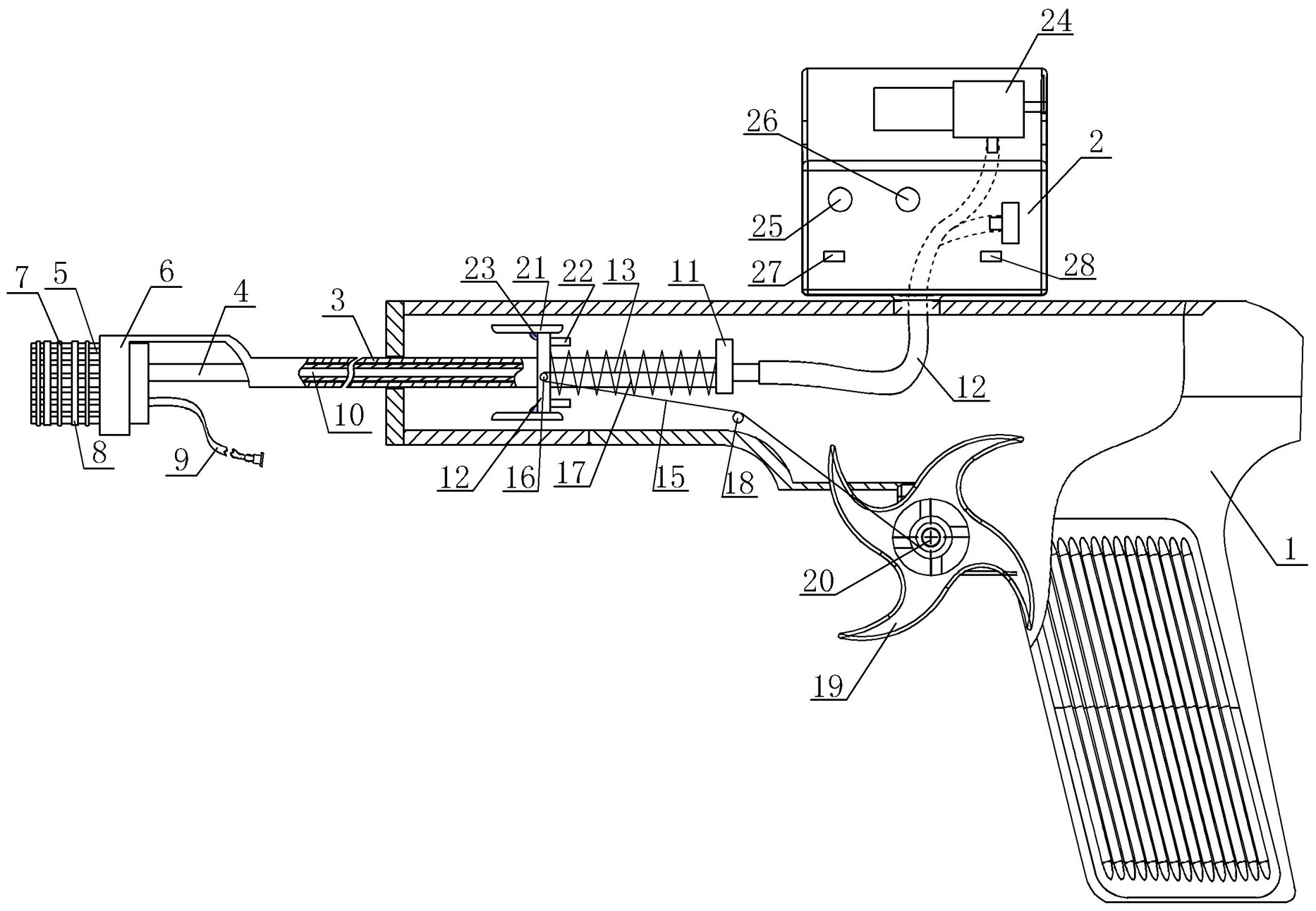 4.根据权利要求1或2所述的一次性注射套扎治疗器,其特征在于:所述吸负压装置(2)由控制电路、负压泵(24)、蓄电池和气体压力传感器组成,吸负压装置通过插接口与枪形体(1)可拆卸连接,负压泵通过三通管分别与压力传感器和插接口相连通,吸气管(4)通过连通管(34)与插接口相连通;吸负压装置的壳体上设置有开关按键(25)、消压按键(26)、电源指示灯(27)、负压指示灯(28)和充电接口,开关按键控制负压泵进行工作,消压按键停止负压泵的工作,充电接口用于对蓄电池进行充电。