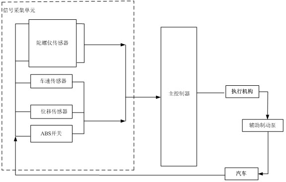 1.车辆辅助驾驶主动限速控制系统,其特征在于:包括主控制器,采集单元和执行机构;所述采集单元包括采集车辆侧向加速度、纵向加速度和车辆俯仰角的陀螺仪传感器,采集制动踏板位置信号的位移传感器和采集车速信号的车速传感器,所述陀螺仪传感器安装在底盘上位于车辆的重心处,所述车速传感器安装在车辆变速器的输出轴上,所述陀螺仪传感器、位移传感器和车速传感器的电信号连接在主控制器的输入端,所述执行机构连接在主控制器的信号输出端;所述执行机构包括步进电机、凸轮和与车辆自身制动总泵并联的辅助制动泵,所述凸轮连接在步进电机的输出轴上,该凸轮外圈与辅助制动泵的制动推杆相抵接触;