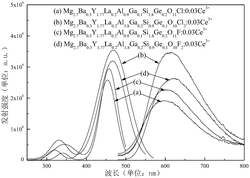 式中:A为Ba、Sr、Ca中的一种或两种以上任意比例的组合,B为Gd、La、Sc中的一种或两种以上任意比例的组合;C为Ga;D为Ge;E为F或Cl;x,y,z,a,b,c为各自的摩尔分数,它们的取值范围分别为:0≤x<0.35;0≤y<0.35;0