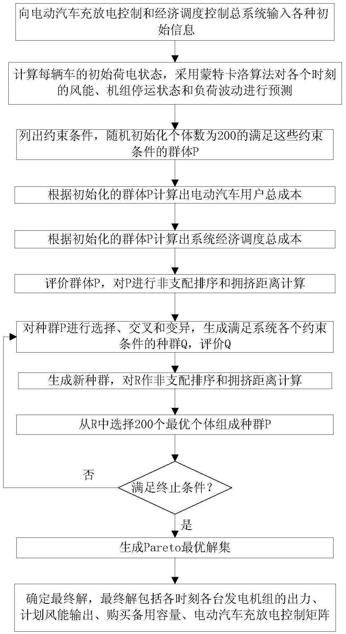 步骤10,判断是否满足终止条件,若不满足约束条件,则返回步骤7;若满足终止条件,则生成Pareto最优解集,并确定最终解,最终解包括各时刻各台发电机组的出力、计划风能输出、购买备用容量、电动汽车充放电控制矩阵,最后由最终解来调整各个时刻的系统运行;