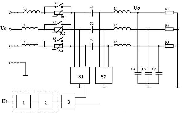 1.一种超高速节能型交流稳压装置,包括市电连接端和稳压电源输出端,其特征是,所述市电连接端与稳压电源输出端之间的三相线路上依次串接有第一储能电感、限流电阻、储能电容以及第二储能电感;