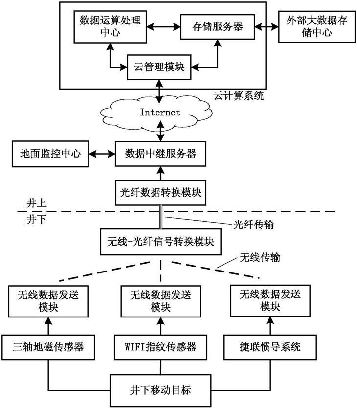 系统还包括设在井下巷道中的无线-光纤信号转换模块和WIFI指纹定位基站,三轴地磁传感器、捷联惯导系统以及WIFI指纹定位传感器安装在移动目标载体上;所述的三轴地磁传感器测量的地磁信息、捷联惯导系统测量移动目标的加速度和角速度信息以及WIFI指纹定位传感器测量的WIFI信号均通过相应的无线信号发送模块将数据传送到对应的无线-光纤信号转换模块,然后利用光纤将定位信息通过光纤数据转换模块传输到数据中继服务器中;数据中继服务器连接地面监控中心并将接收到的定位信息通过Internet网发送给设置在远端的云计算系统,云计算系统实时处理定位信息,云管理模块控制存储服务器将数据运算中心结算好的定位数据发送给与云计算系统连接的外部大数据存储中心。