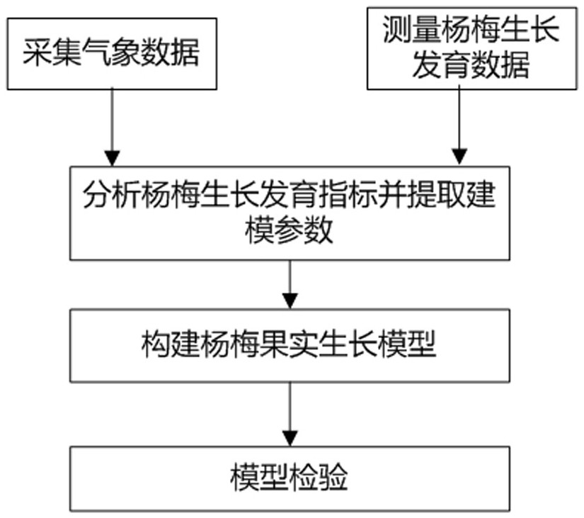 5.根据权利要求1所述的一种基于温光的设施杨梅果实生长模拟方法,其特征在于:所述的步骤B测定杨梅果实生长数据是:杨梅树坐果后,待60%以上果实长到一定直径,选取大棚内杨梅树作为样株,每隔一定时间测量样株上面沿东南西北方向的果实直径数据,具体通过棉线环绕杨梅最大周长一圈测量。
