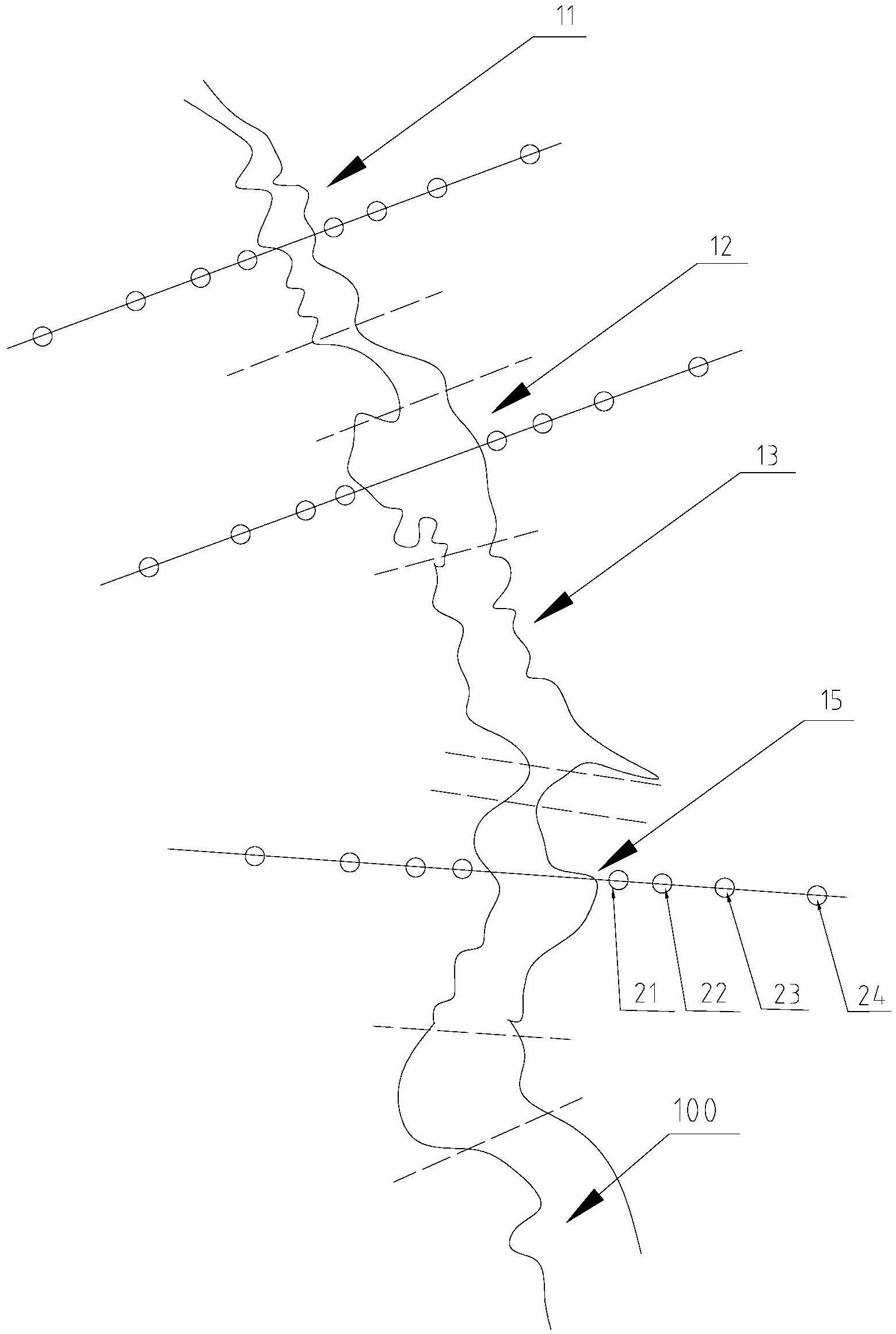 5m的长度范围内选择一个监测点,如果地形有起伏,则在起伏处增加监测点,(b)如果中裂缝段的长度大于10m,在每5-10m的长度范围内选择一个监测点,如果地形有起伏,则在起伏处增加监测点;