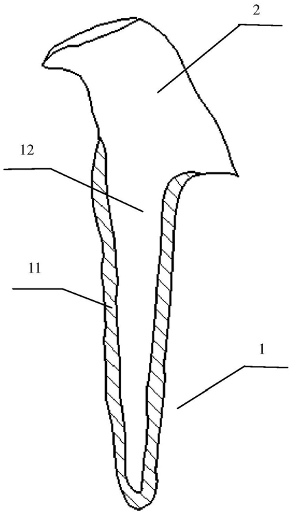2.如权利要求1所述的模拟自然牙力学性能的个性化金属牙桩,其特征在于:疏松部和致密部分别由两种弹性模量不同的材料制成,疏松部材料的弹性模量低于致密部材料的弹性模量。