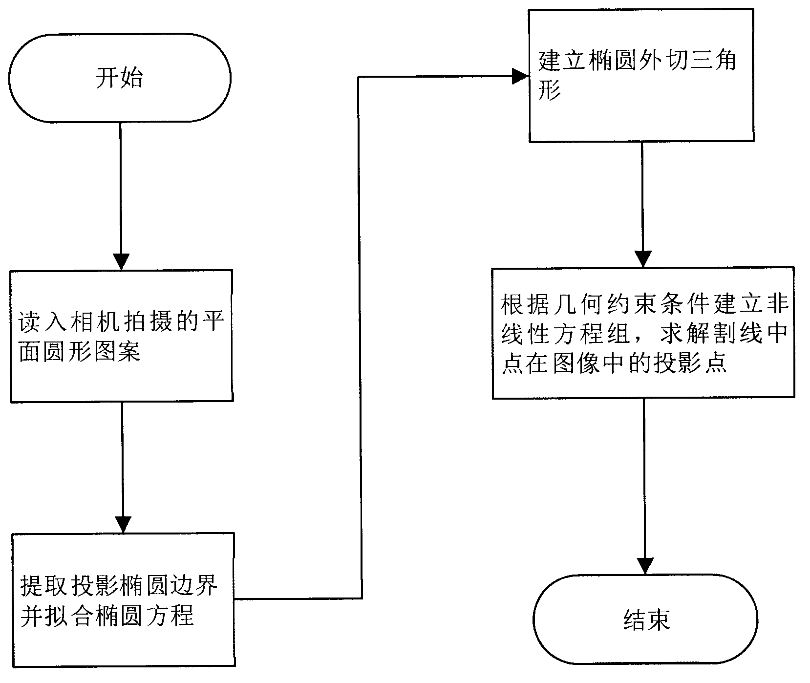 1.一种从平面单个圆形图案的投影图像中精确提取圆心投影点的方法,用于相机标定以及视觉测量;其特征是从投影椭圆图像入手,提取边界点集合;在投影椭圆的边界点中任取三点,计算椭圆切线以及各切线交点;根据选择的三个边界点给出包含未知参量的割线中点投影点以及对应的无穷远点投影点的表达式;根据几何约束条件构造包含未知参量的方程组;解方程组得到各参量的值,从而得到圆心投影点坐标;包含以下几个步骤:(1)提取投影椭圆边界并拟合椭圆方程;