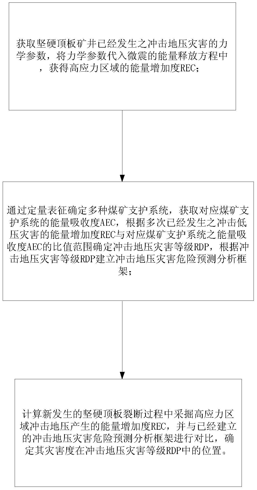 1. 一种坚硬顶板矿井冲击地压灾害危险性预测分析方法,其特征在于,其包括以下步 骤: 步骤一,获取坚硬顶板矿井已经发生之冲击地压灾害的力学参数,将力学参数代入微 震的能量释放方程中,获得高应力区域的能量增加度REC ; 步骤二,定量表征多种煤矿支护系统,获取对应煤矿支护系统的能量吸收度AEC,根据 多次已经发生之冲击低压灾害的能量增加度REC与对应煤矿支护系统之能量吸收度AEC的 比值范围确定冲击地压灾害等级RDP,根据冲击地压灾害等级RDP建立冲击地压灾害危险 预测分析框架; 步骤三,计算新发生的坚硬顶板裂断过程中采掘高应力区域冲击地压产生的能量增加 度REC,并与已经建立的冲击地压灾害危险预测分析框架进行对比,确定其灾害度在冲击地 压灾害等级RDP中的位置。