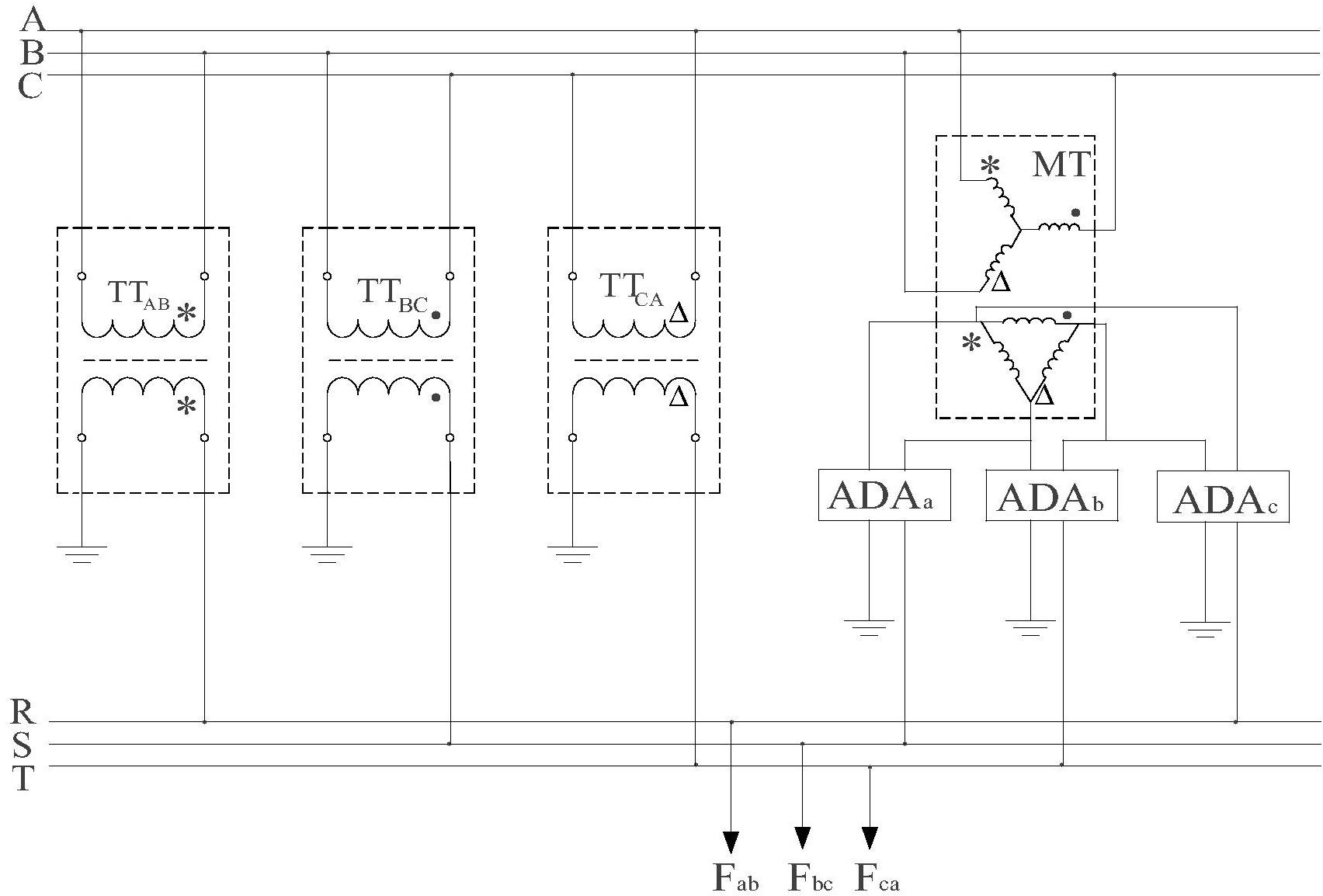1.一种多馈线组合式供变电构造,主要由牵引变压器和有源补偿装置组成;其特征在于:牵引变压器至少具有二台,均为单相接线;有源补偿装置由匹配变压器MT和交直交变流器ADA构成,其匹配变压器MT为三相YNd接线,交直交变流器ADA为单相结构;各个牵引变压器原边绕组依次连接于高压母线ABC三个线电压UAB、UBC、UCA,其中连接于线电压UAB上的牵引变压器记为牵引变压器一TTAB,连接于线电压UBC上的牵引变压器记为牵引变压器二TTBC,连接于线电压UCA上的牵引变压器记为牵引变压器三TTCA;匹配变压器MT的三个原边绕组分别连接于同一高压母线ABC三个相电压UA、UB、UC,匹配变压器MT的三个次边绕组分别连接三组交直交变流器的输入端口,其中连接于相电压UA的一组交直交变流器记为交直交变流器一ADAa,连接于相电压UB的一组交直交变流器记为交直交变流器二ADAb,连接于相电压UC的一组交直交变流器记为交直交变流器三ADAc;牵引变压器一TTAB次边绕组与交直交变流器三ADAc的输出端口相并联,一端接地,一端经牵引母线R输出馈线一Fab;牵引变压器二TTBC次边绕组与交直交变流器一ADAa的输出端口相并联,一端接地,一端经牵引母线S输出馈线二Fbc;牵引变压器三TTCA次边绕组与交直交变流器二ADAb的输出端口相并联,一端接地,一端经牵引母线T输出馈线三Fca;馈线一Fab、馈线二Fbc、馈线三Fca的电压分别对应原边三个线电压UAB、UBC、UCA,其大小相同、相位互差120°。