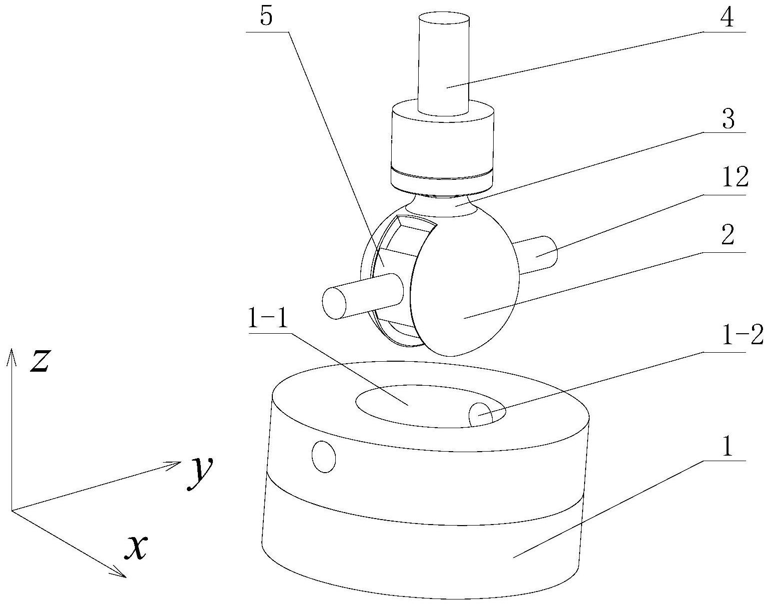 1. 一种可测空间三自由度回转角及偏移量的球铰链,包括球窝底座、球头、球头连接杆、输出杆、弧形滑块、销轴和空间回转角测量装置,其特征在于: