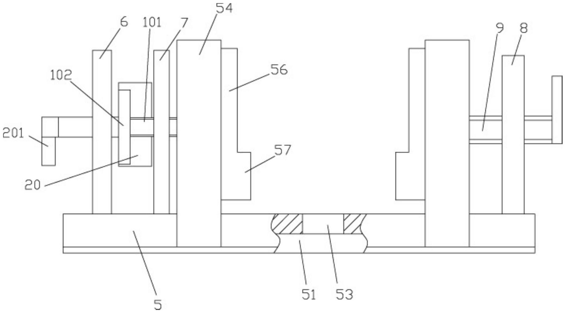 纵向调节底盘(5)的左侧上部固定有第一主支撑板(6)和第二主支撑板(7),第二主支撑板(7)靠近左侧的调节夹持块(54),纵向调节底盘(5)的右侧上部固定有第三主支撑板(8),至少两个纵向调节螺杆(9)螺接在第三支撑板(8)上,纵向调节螺杆(9)的右端伸出第三主支撑板(8)并固定有转动部(91),纵向调节螺杆(9)的左端伸出第三主支撑板(8)并铰接在右侧的调节夹持块(54)的右侧壁上;
