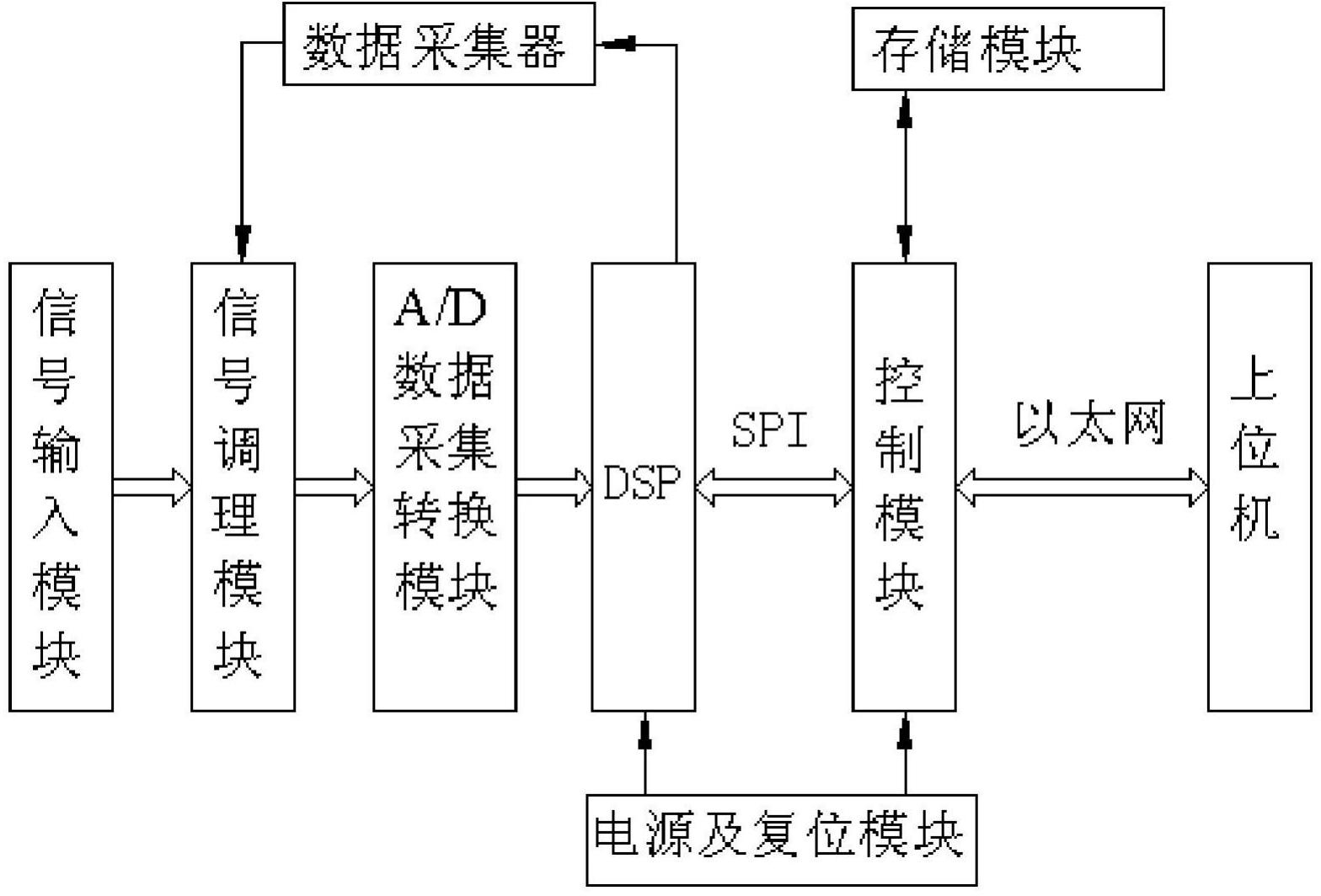 然后,DSP根据上位机发送的指令对采集的数据进行时频域分析,再将采集的原始数据和经DSP分析的数据通过SPI发送给控制模块,控制模块将数据格式还原并保存起来,并经以太网传输到上位机进行分析与显示。