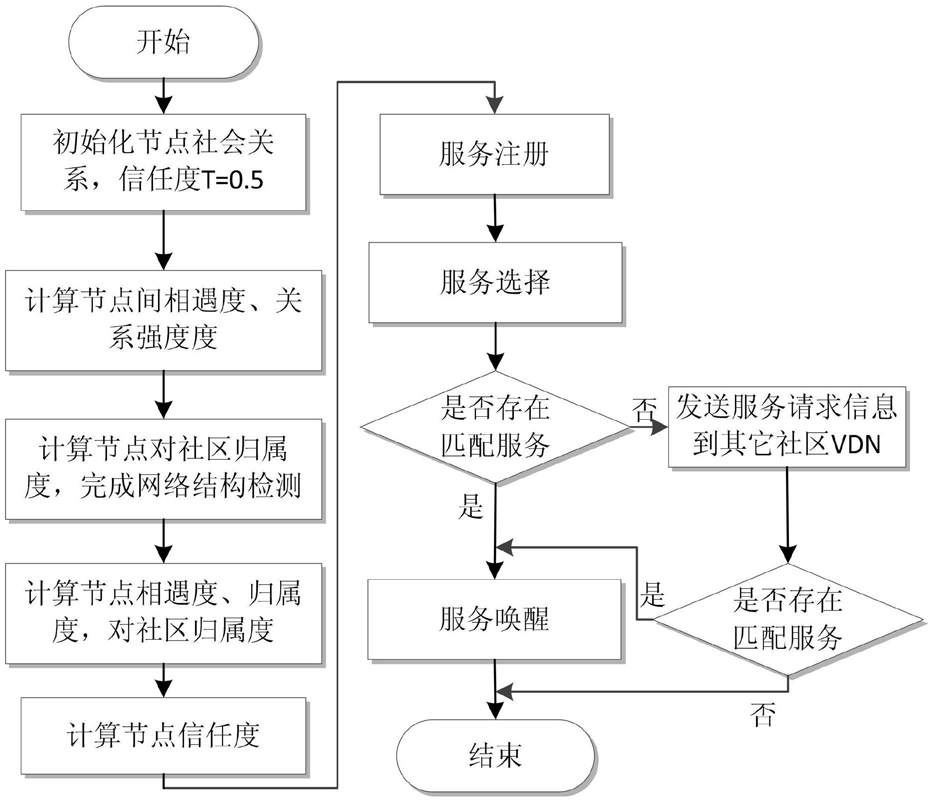 4.根据权利要求1所述的方法,其特征在于,所述利用节点信任度高的GAN实现消息在各个社区之间的转发进一步具体包括:当SPN产生服务注册或撤销消息时,通过信任度高及与虚拟目录节点VDN相遇度高的节点转发给VDN,完成服务注册或撤销,当VDN收到服务请求消息,从自身存储的服务信息中搜索匹配服务信息并选择信任度不小于阈值的节点作为SPN,完成服务选择工作,若不存在匹配服务信息,则通过分布式方式向其他社区VDN发送服务请求信息,完成服务选择过程。