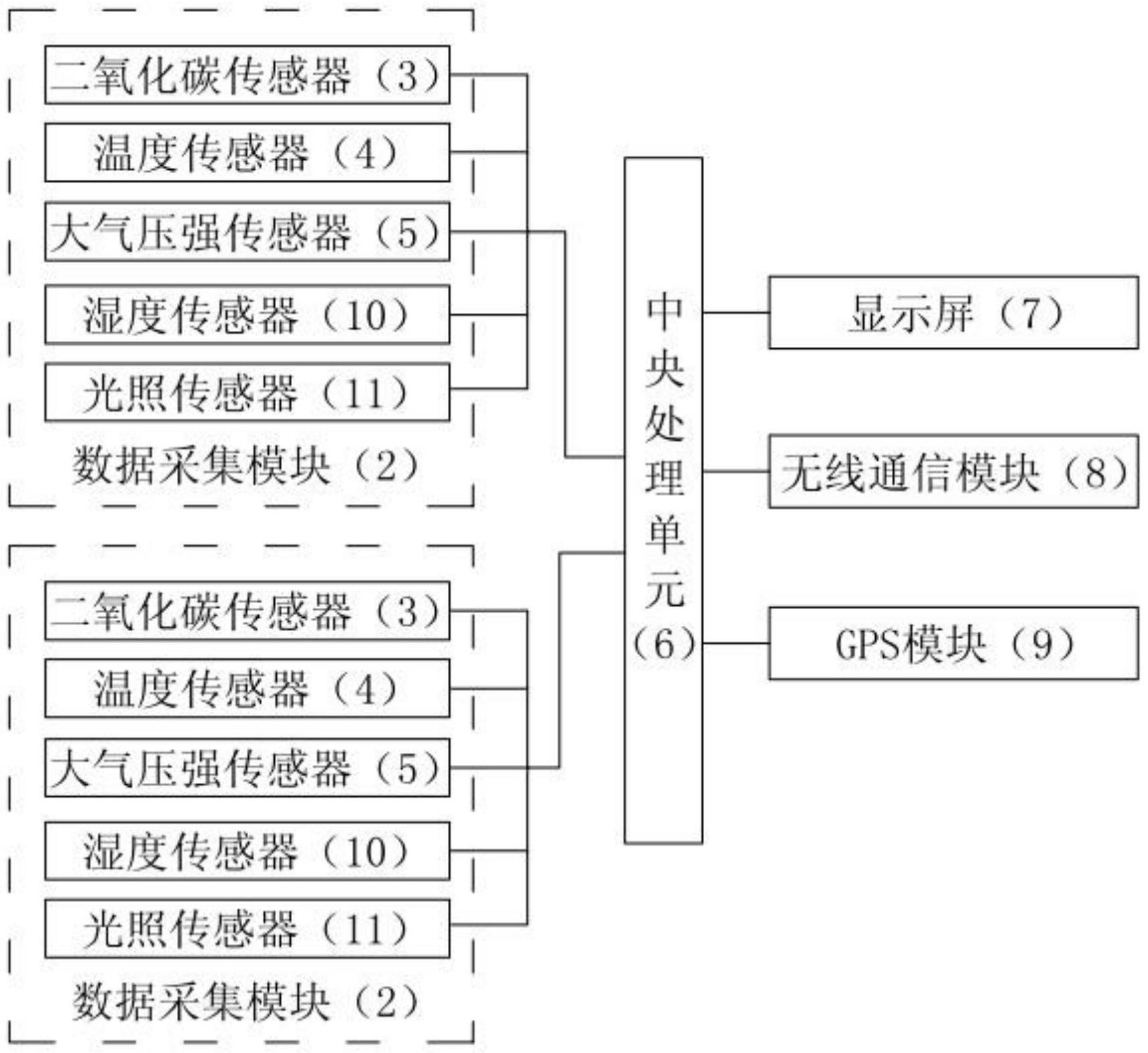 1.一种开放型土壤碳通量监测仪,其特征在于:包括圆筒(1),所述圆筒(1)的顶部和底部都开口,所述圆筒(1)内壁上设有两个数据采集模块(2),所述两个数据采集模块(2)分别位于圆筒(1)内壁的顶部和底部,所述数据采集模块(2)包括二氧化碳传感器(3)、温度传感器(4)和大气压强传感器(5),所述圆筒(1)上还设有中央处理单元(6)和显示屏(7),所述中央处理单元(6)分别与显示屏(7)以及每个数据采集模块(2)的二氧化碳传感器(3)、温度传感器(4)和大气压强传感器(5)电连接。