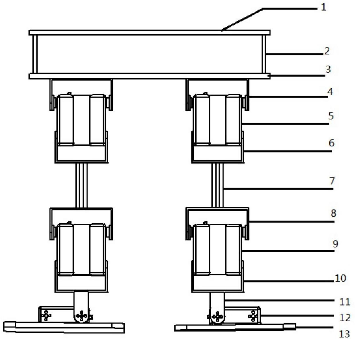 两个第二舵机(9)的下端分别通过电机垫片与两块第四U形连接件(10)的U形口对应活动连接,两块第四U形连接件(10)的底座分别通过固定连接件与两块第五U形连接件(11)的底座对应连接;两块第五U形连接件(11)的U形口通过电机垫片与两个第三舵机(12)对应活动连接;两个第三舵机(12)分别固定安装在两个脚板(13)上;其中,第一U形连接件(4)、第三U形连接件(8)、第五U形连接件(11)的U形口长度小于第二U形连接件(6)、第四U形连接件(10)的U形口长度。