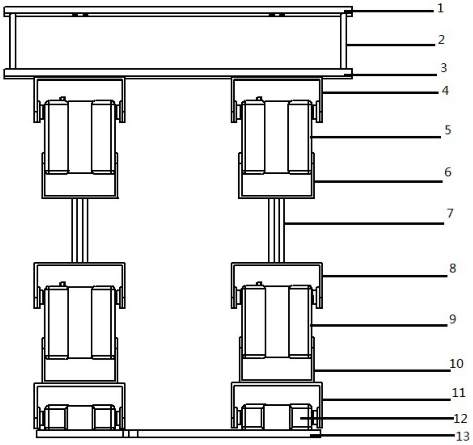 1.一种双足交叉足机器人,包括顶板(1)、控制板(3)、铜柱、U形连接件、舵机和两块F形脚板(13),其特征在于,所述铜柱包括第一铜柱(2)和第二铜柱(7),所述U形连接件包括第一U形连接件(4)、第二U形连接件(6)、第三U形连接件(8)、第四U形连接件(10)和第五U形连接件(11),所述舵机包括第一舵机(5)、第二舵机(9)和第三舵机(12),所述顶板(1)与控制板(3)之间通过四根第一铜柱(2)固定连接,且顶板(1)与控制板(3)之间相互保持平行;所述控制板(3)下表面通过固定连接件分别与两块第一U形连接件(4)的底座相连接,所述控制板(3)下端的两个第一舵机(5)分别夹设于两块第一U形连接件(4)的U形口内,且所述两块第一U形连接件(4)的U形口分别通过电机垫片与两个第一舵机(5)的上端对应活动连接;所述两个第一舵机(5)的下端分别通过电机垫片与两块第二U形连接件(6)的U形口对应活动连接,所述两块第二U形连接件(6)的底座分别通过两根第二铜柱(7)与两块第三U形连接件(8)的底座相连接,所述两个第二舵机(9)分别夹设于两块第三U形连接件(8)的U形口内,且所述两块第三U形连接件(8)的U形口分别通过电机垫片与两个第二舵机(9)的上端对应活动连接;所述两个第二舵机(9)的下端分别通过电机垫片与两块第四U形连接件(10)的U形口对应活动连接,所述两块第四U形连接件(10)的底座分别通过固定连接件与两块第五U形连接件(11)的底座相连接;所述两块第五U形连接件(11)的U形口通过电机垫片与两个第三舵机(12)对应活动连接;所述两个第三舵机(12)分别固定安装在两块F形脚板(13)上;其中,第一U形连接件(4)、第三U形连接件(8)、第五U形连接件(11)的U形口长度小于第二U形连接件(6)、第四U形连接件(10)的U形口长度。