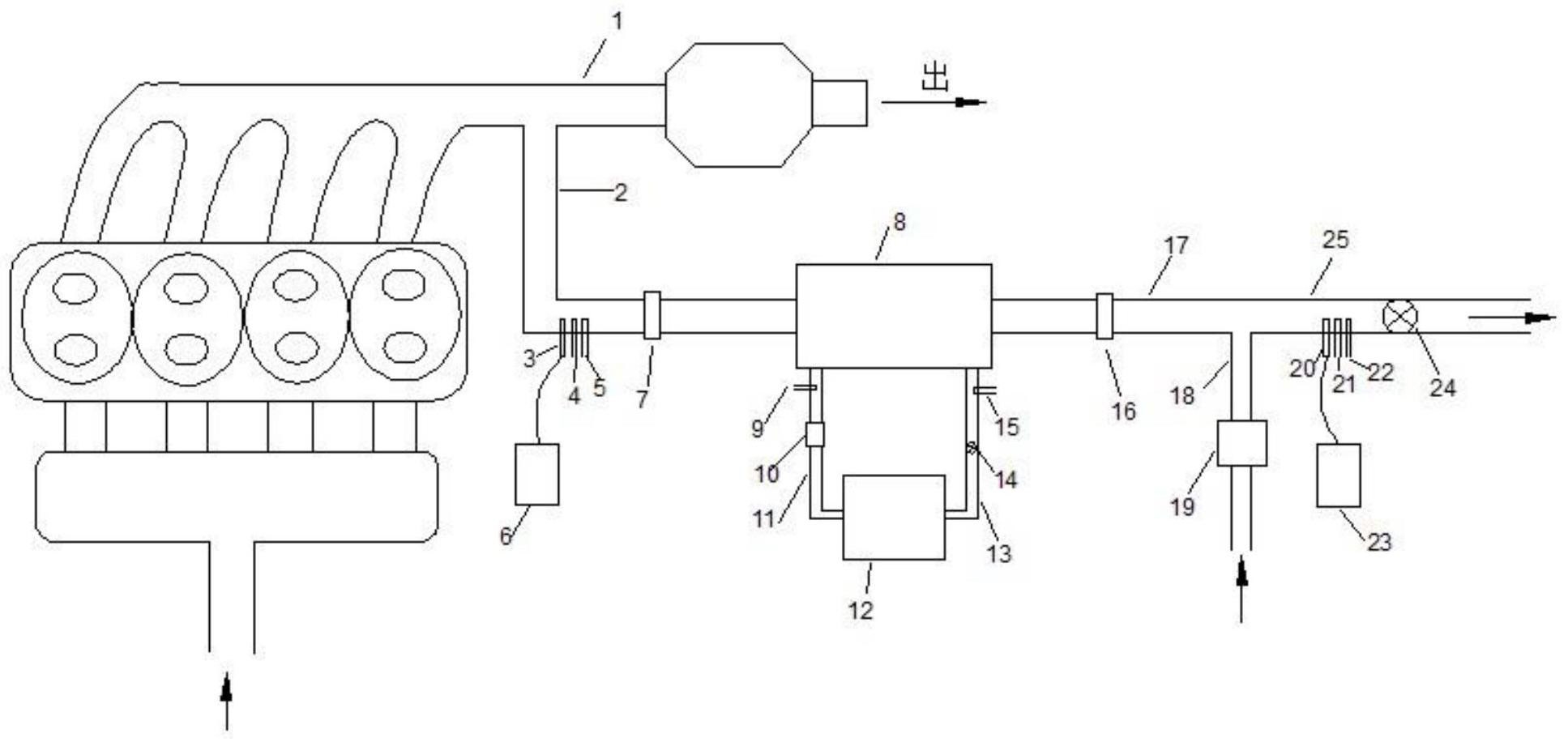 3.根据权利要求1所述的废气再循环中冷器换热效率试验台,其特征在于,所述前EGR管(2)上还设置有前气体取样口(3),前气体取样口(3)连接前气体分析仪(6);所述后EGR管(17)与EGR尾管(25)之间连接有标准气进气管(18),标准气进气管(18)上设有标准气流量计(19);所述EGR尾管(25)上设有后气体取样口(20)和背压阀(24),后气体取样口(20)连接后气体分析仪(23);所述背压阀(24)、前气体分析仪(6)、标准气流量计(19)和后气体分析仪(23)分别连接电子控制单元。