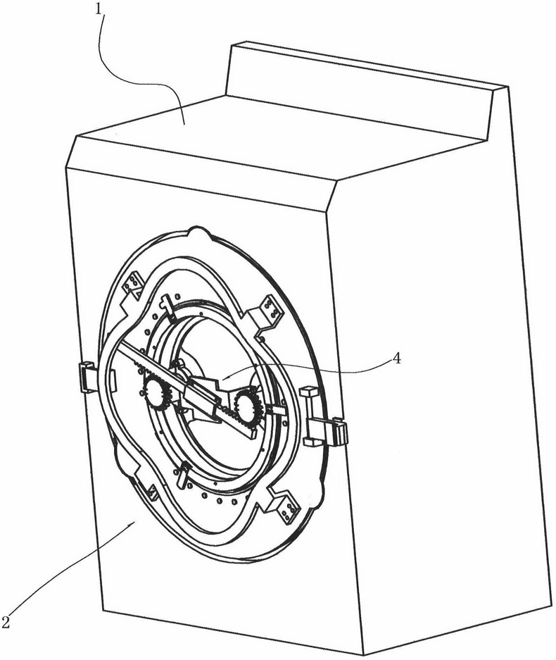 内盖(22),能转动地密封连接在所述外圈板(21)的内周缘上,所述内盖(22)的内表面上设有第一外齿轮(23),对应地,所述洗衣机壳体(1)上设有与所述第一外齿轮(23)相啮合的传动齿轮组(11),驱动装置(12)驱动连接所述传动齿轮组(11);