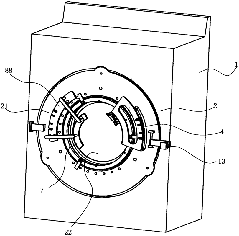 外圈板(21),其一端铰接在洗衣机壳体(1)上,另一端可拆卸地连接洗衣机壳体(1);