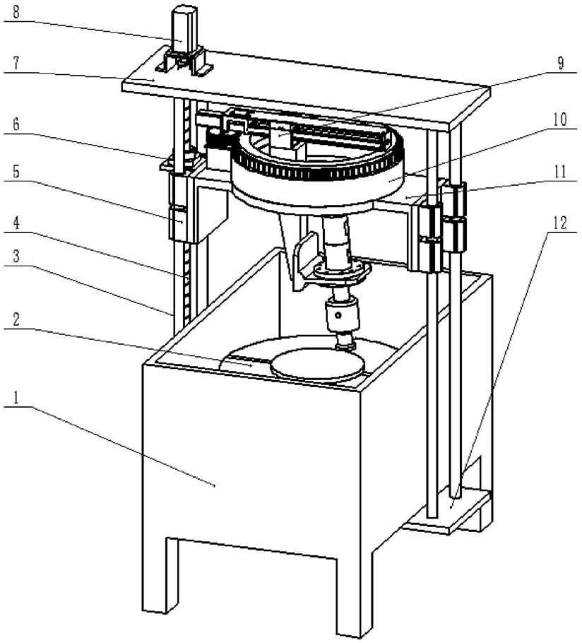 3.根据权利要求1所述的一种针对大面积超光滑表面的气液固三相磨粒流抛光装置,其特征在于:所述光轴导轨(3)设有四根,且均匀设在支撑平板(11)短边的外侧,四根光轴导轨(3)上端固接上板(7),下端固接下板(12);所述丝杠(4)的下端连接下板(12),丝杠(4)的上端穿过上板(7)连接上板(8),上板(8)通过电机座固定在上板(7)上。