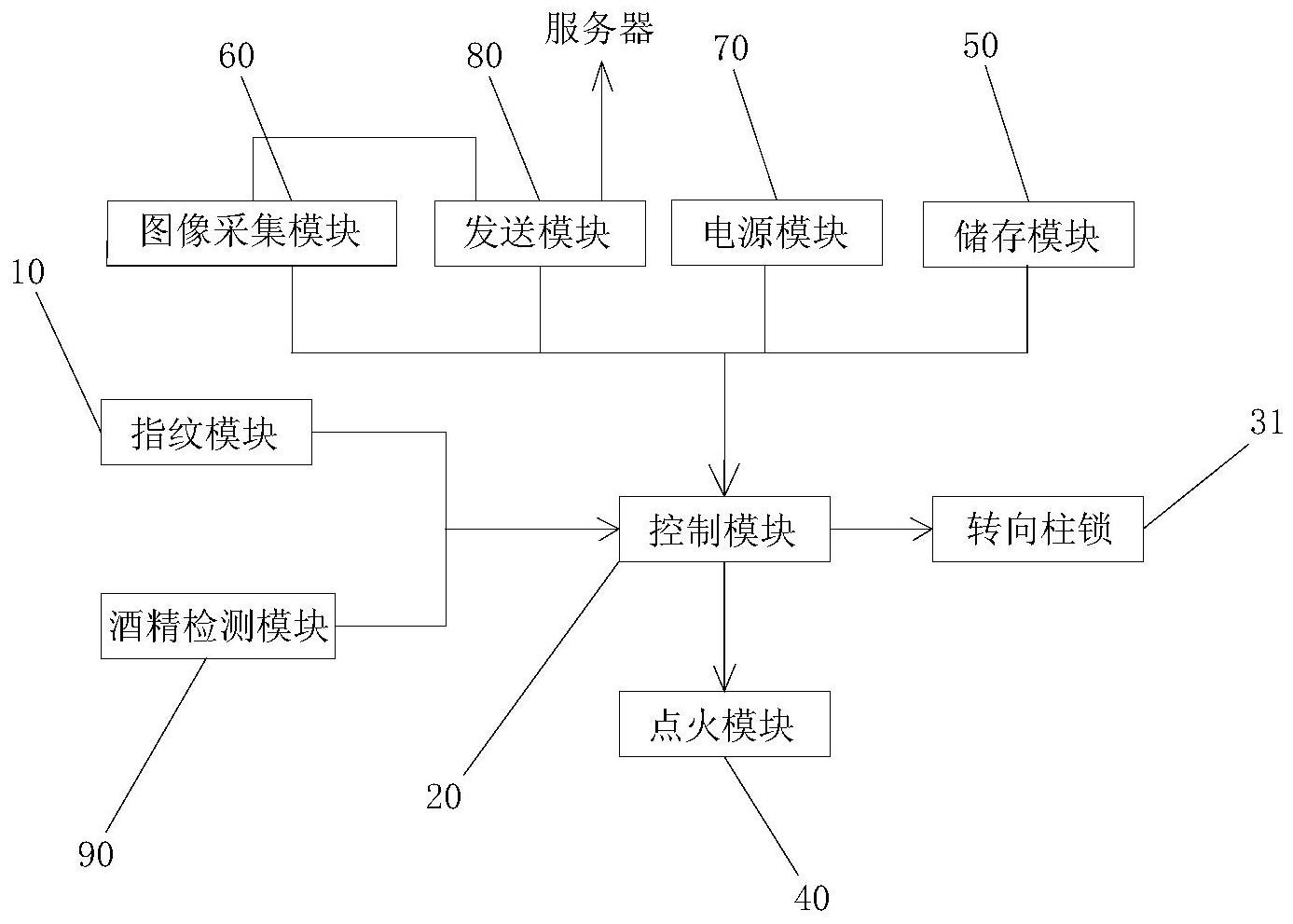 S1:指纹模块对驾驶者的指纹进行采集并输送至控制模块进行分析判断,若判断正确则执行操作S2,若判断错误则转向柱锁不进行解锁、点火模块无法正常点火;