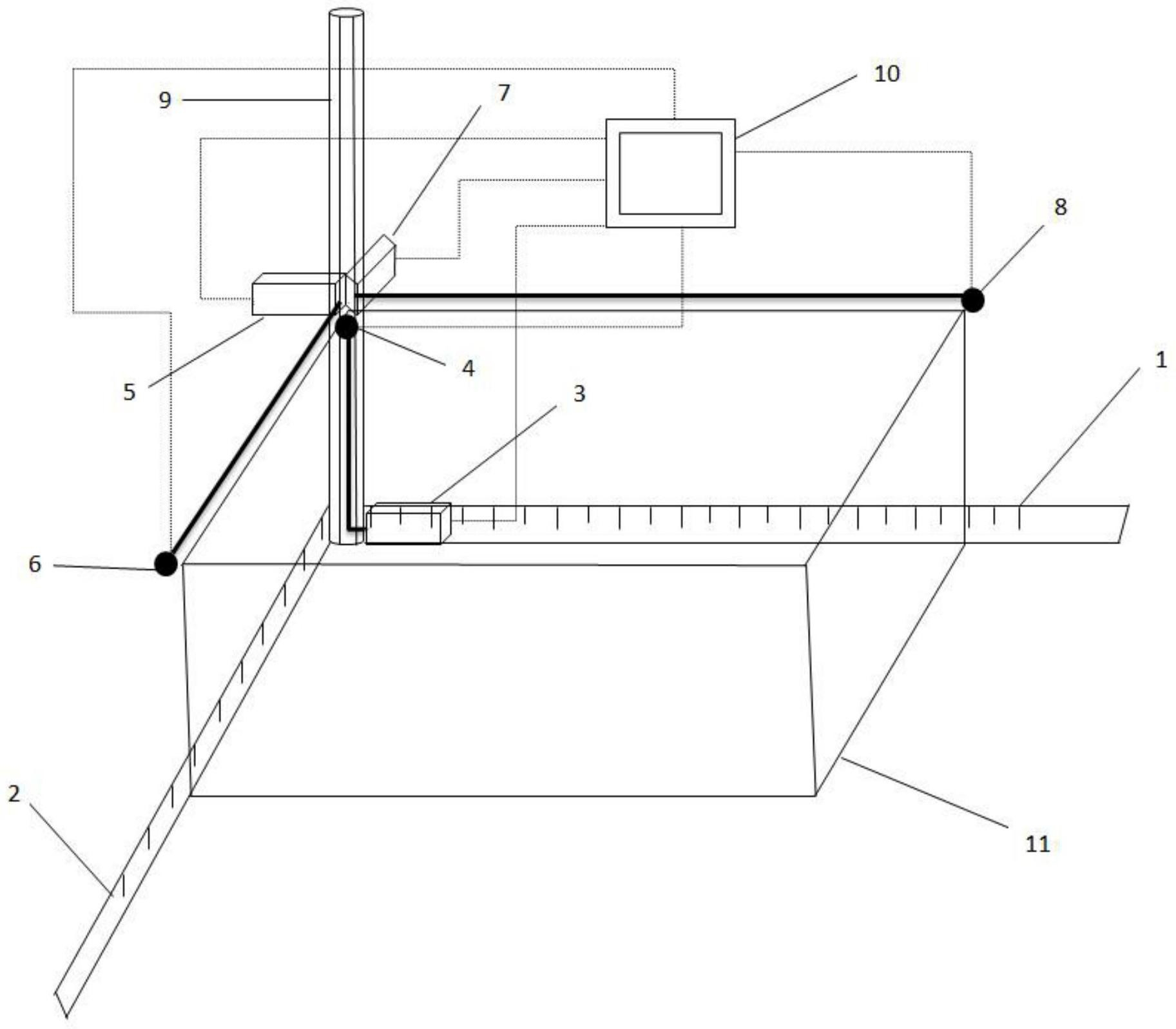 步骤3、将拉线式位移传感器a(5)的探头沿挡板b(2)的方向水平拉出至快递包裹(11)的顶点处,按下按钮开关a(6),然后松手同时上位机(10)将保存当前测量的数据作为快递包裹(11)的宽,然后将拉线式位移传感器b(7)的探头沿挡板a(1)的方向水平拉出至快递包裹(11)的顶点处,按下按钮开关b(8),然后松手同时上位机(10)将保存当前测量的数据作为快递包裹(11)的长,再将拉线式位移传感器c(3)的探头沿导轨(9)的方向竖直拉出至快递包裹(11)的顶点处,按下按钮开关c(4),然后松手上位机(10)将保存当前测量的数据作为快递包裹(11)的高。