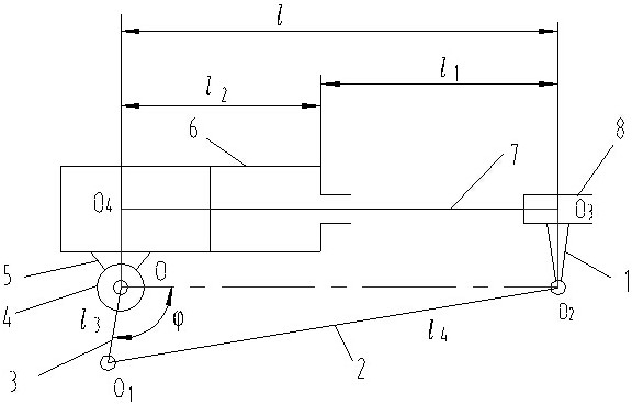 式中,l为O3和O4两点之间的距离,l1为活塞杆伸出长度,l2为O4点到油缸的活塞杆出口处的距离,l3为摆臂的长度,即O和O1两点之间的距离,O1为连杆(2)与摆臂的铰接点,l4为连杆的长度,即O1和O2两点之间的距离,为转角传感器(4)转动的角度,即摆臂与O和O2这两点连线的夹角。