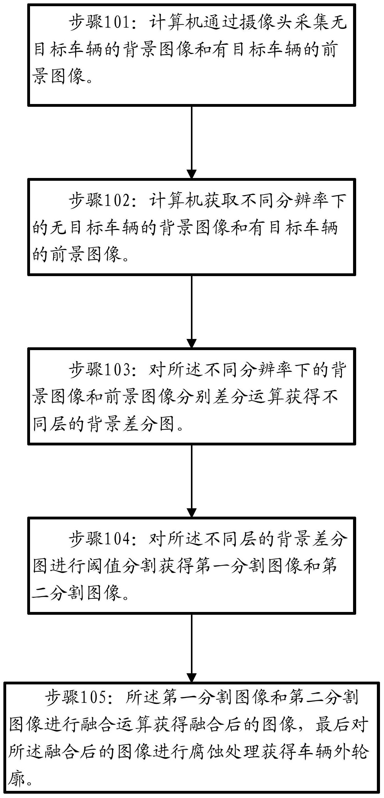 1.一种车辆外轮廓检测方法,其特征在于,该方法为:计算机获取不同分辨率下的无目标车辆的背景图像和有目标车辆的前景图像,然后对所述不同分辨率下的背景图像和前景图像分别差分运算获得不同层的背景差分图,对所述不同层的背景差分图进行阈值分割获得第一分割图像和第二分割图像,所述第一分割图像和第二分割图像进行融合运算获得融合后的图像,最后对所述融合后的图像进行腐蚀处理获得车辆外轮廓;