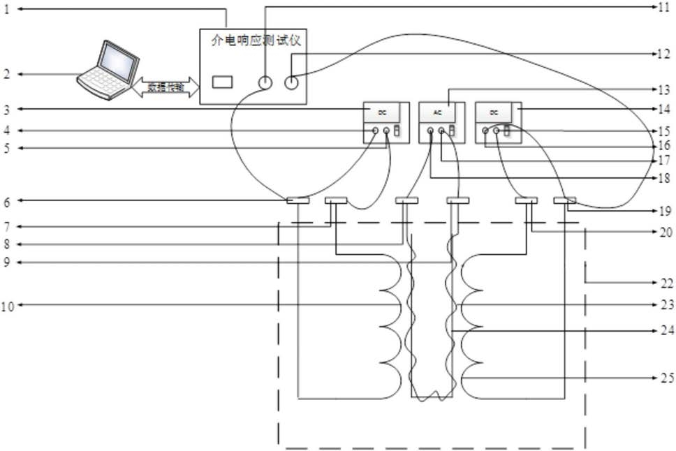 1.负载条件下牵引变压器频域介电响应的实验方法,包括实验系统和实验步骤,其特征在于,实验系统包括介电响应测试仪(1)、计算机(2)、第一可调直流电源(3)、可调交流电源(13)、第二可调直流电源(14)与实验变压器(22);
