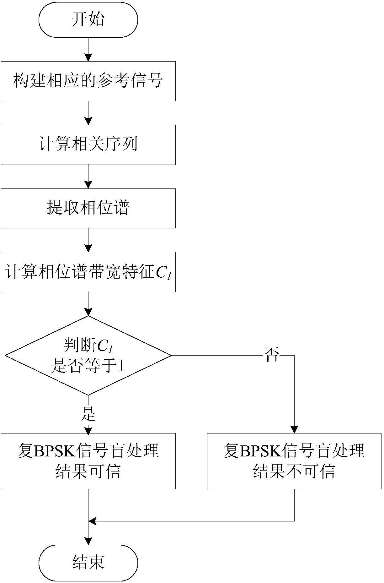 步骤3,检验评估结果:若C1=1,则调制识别结果正确且无解码错误,复BPSK信号盲处理结果可信,假设成立;若C1=0,则调制识别结果错误或存在解码错误,复BPSK信号盲处理结果不可信,假设不成立。
